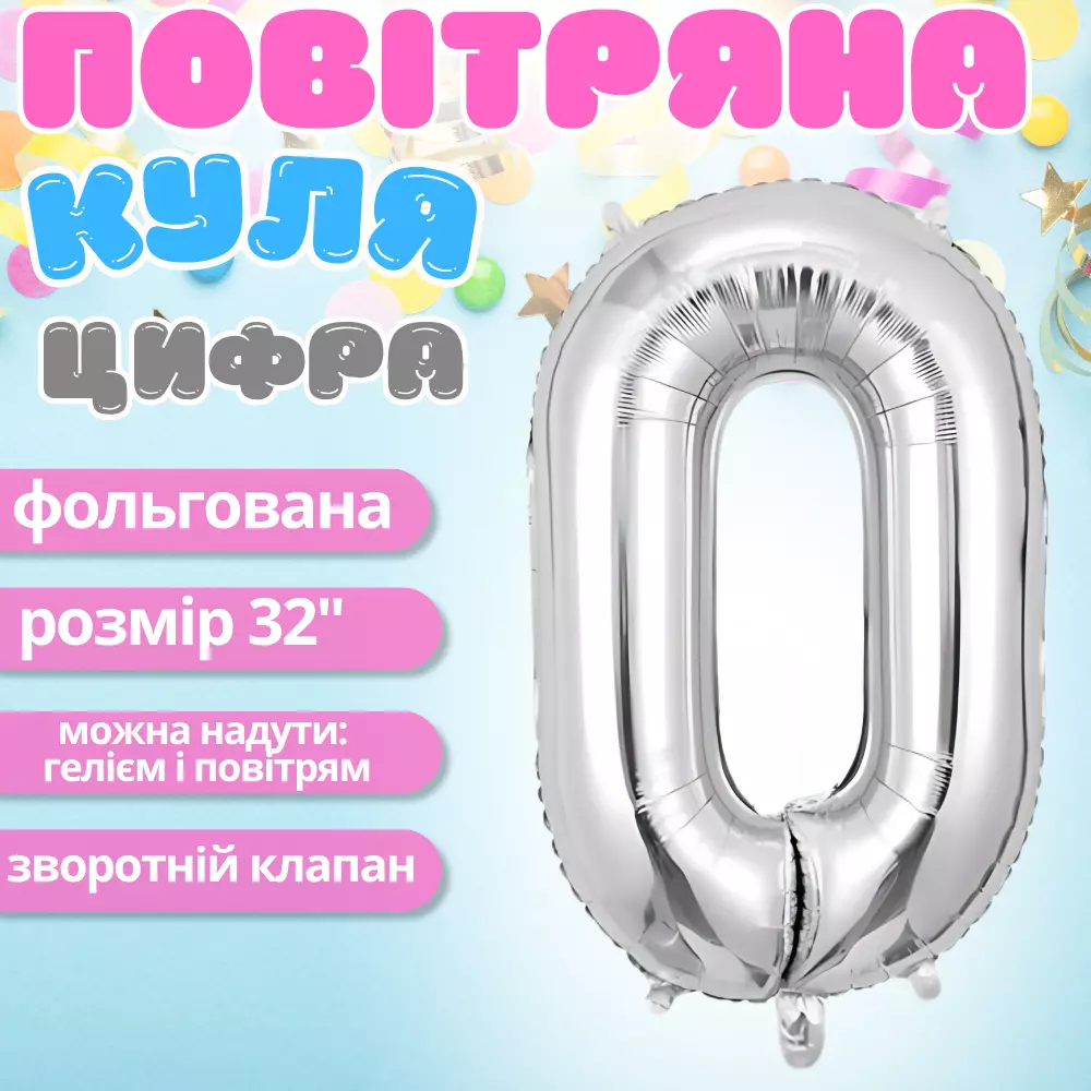 Фольгована повітряна кулька у вигляді цифри «0» сріблястого кольору