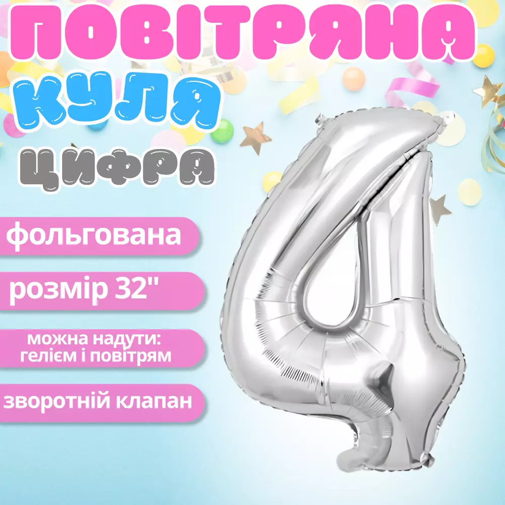 Фольгована куля у вигляді цифри «4» сріблястого кольору - ефектний