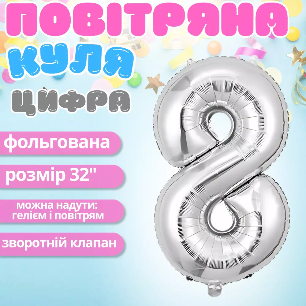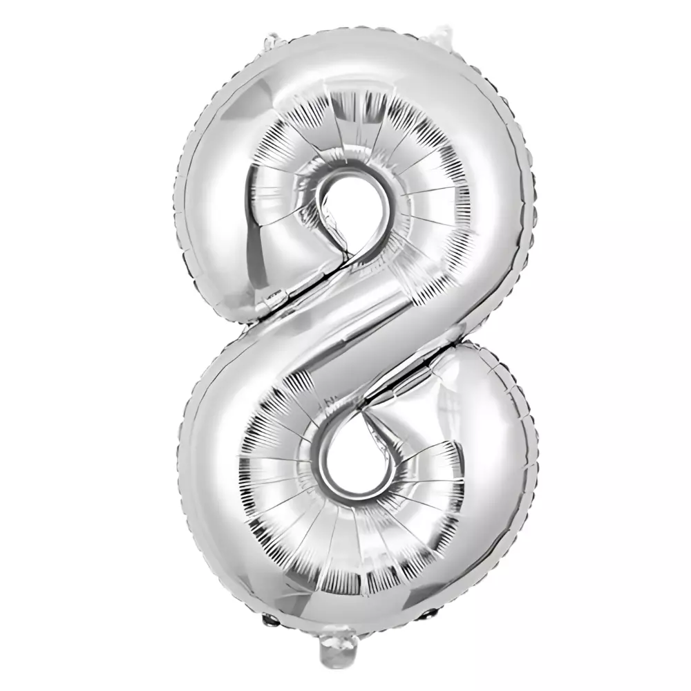 Фольгована повітряна куля у формі цифри «8» сріблястого кольору -