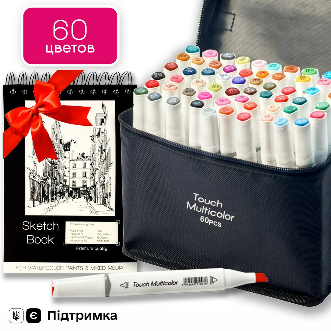 Ви купуєте Набір маркерів двосторонніх Touch Multicolor 60 кольорів та в подарунок отримуєте Папір для скетчингу та малювання у форматі А5.