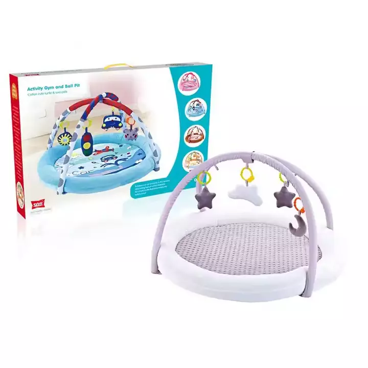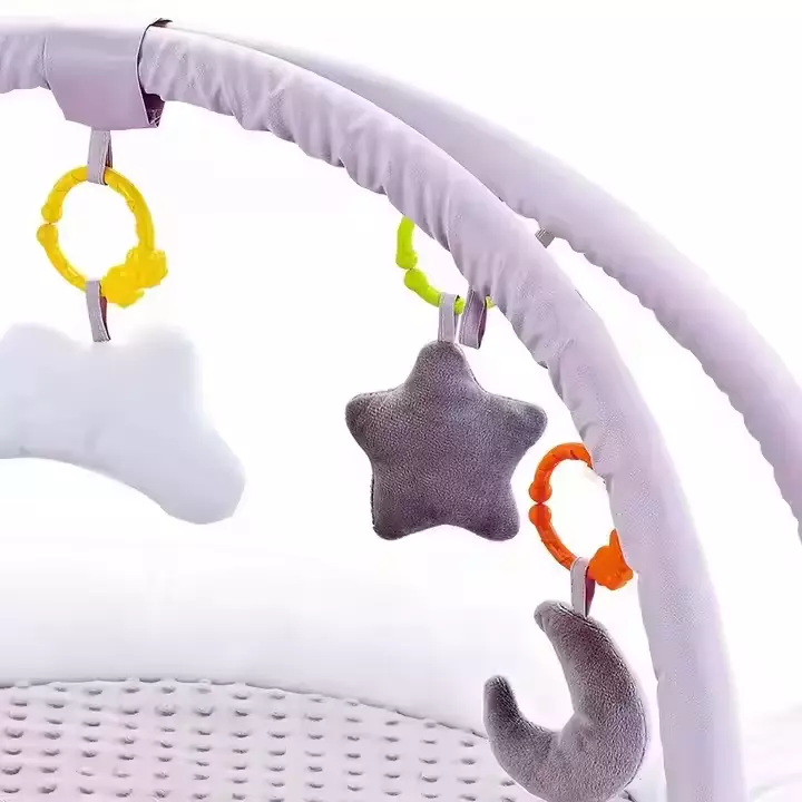 Килимок оснащений комплектом з чотирьох знімних підвісних іграшок, які можна використовувати окремо, закріплюючи на візку або в кімнаті. М'який матеріал килимка забезпечує комфорт, а стійкий каркас із м'яких трубок запобігає травмам і робить конструкцію надійною.