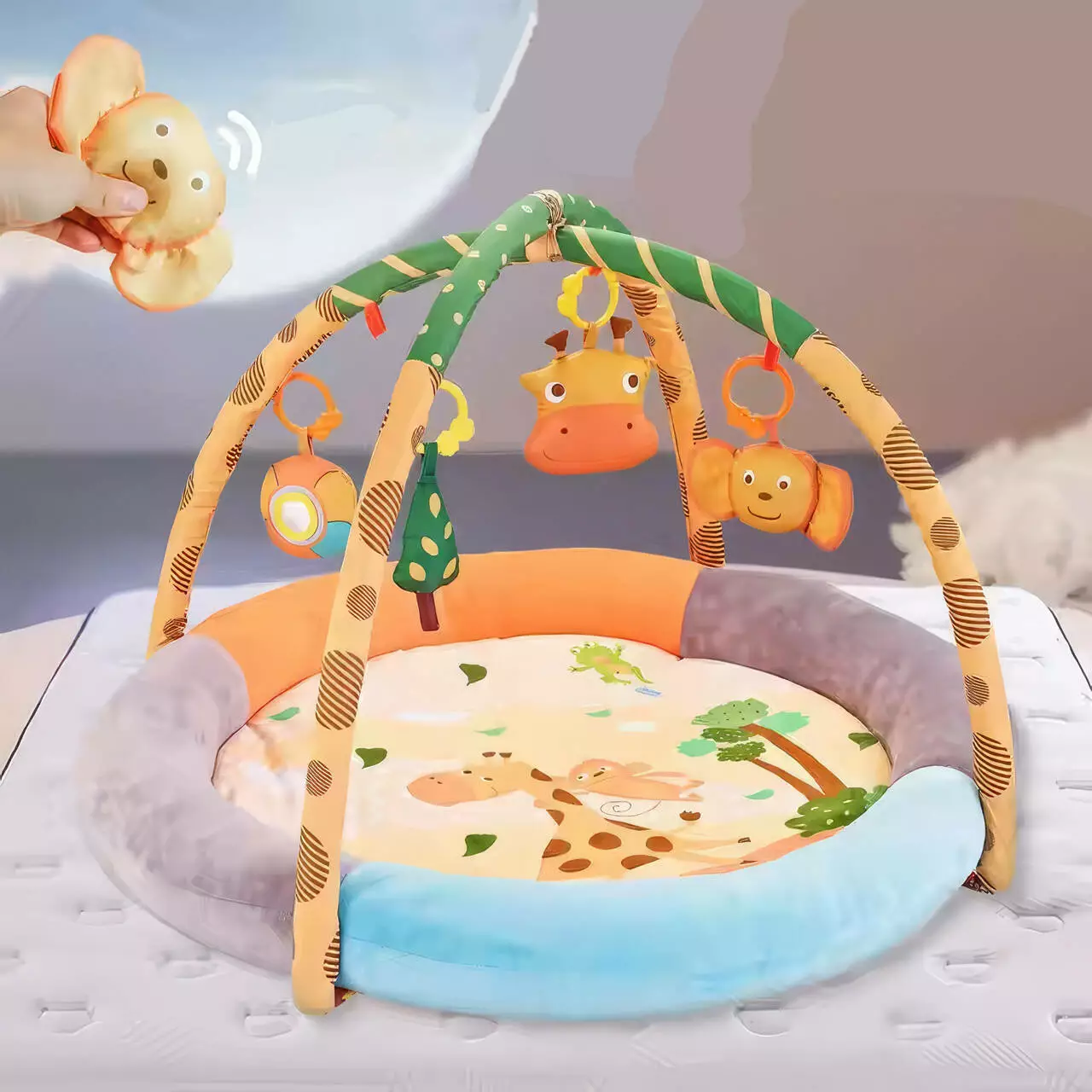 Килимок оснащений комплектом з чотирьох знімних підвісних іграшок, які можна використовувати окремо, закріплюючи на візку або в кімнаті. М'який матеріал килимка забезпечує комфорт, а стійкий каркас із м'яких трубок запобігає травмам і робить конструкцію надійною.