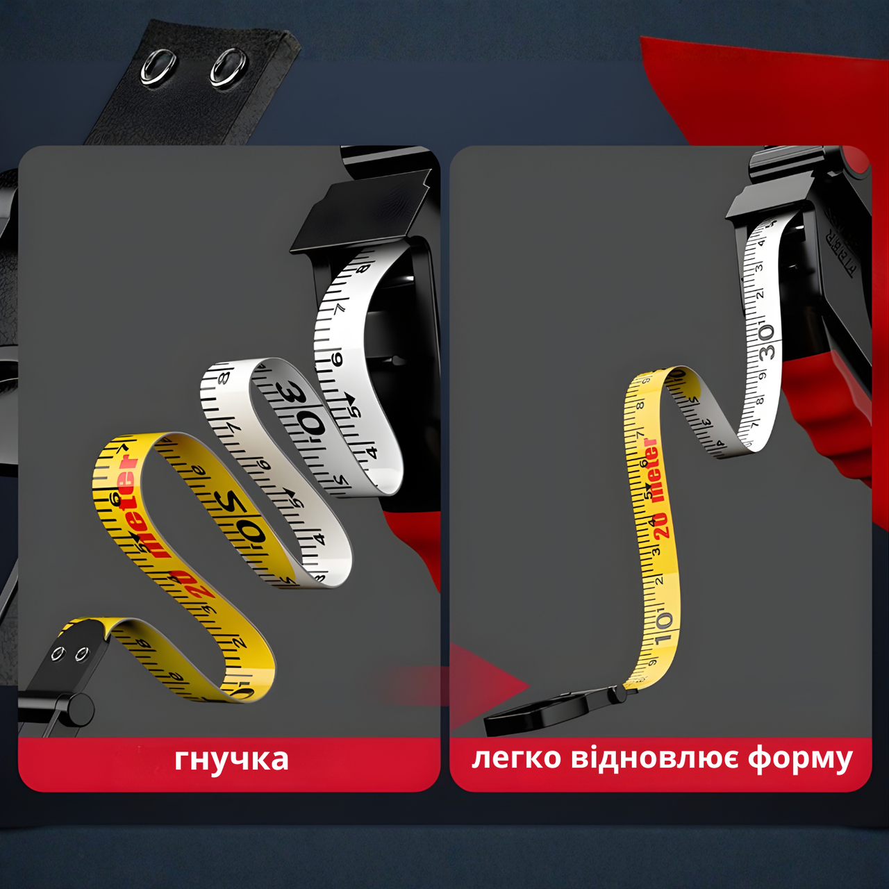 Двостороння чітка шкала з метричною розміткою добре читається, не стирається з часом і забезпечує високу точність вимірювань. Стрічка має ефект самовідновлення — після вигинів вона вирівнюється, не утворюючи заломів.