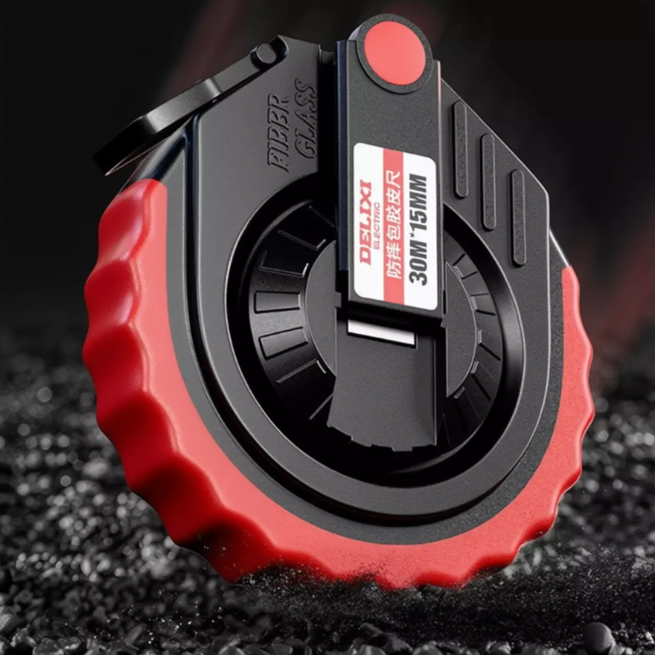 Рулетка будівельна вимірювальна 30 м, для геодезистів стрічка з метричною шкалою і скловолокна, з ручкою, пластикова чорно-червона