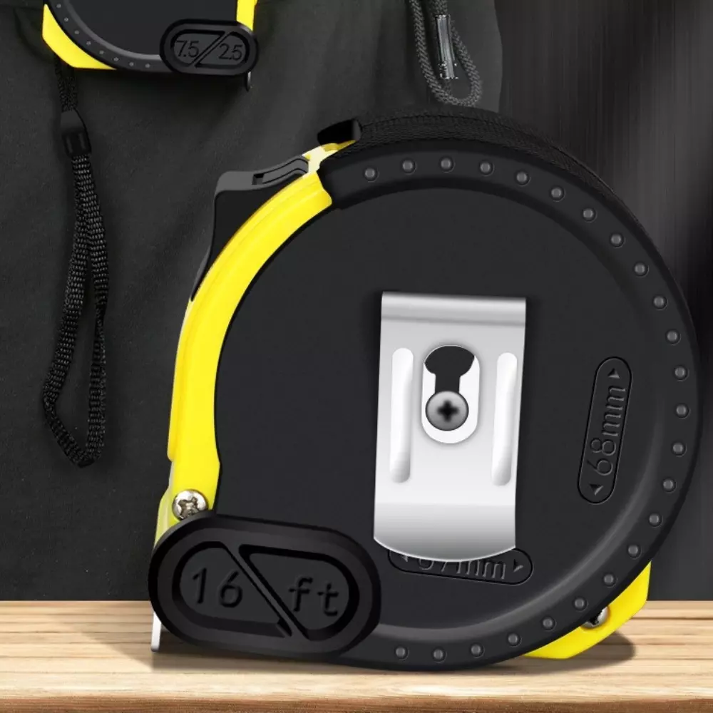 Корпус виготовлений з ударостійкого пластику з прогумованими вставками, завдяки чому рулетка зручно лежить у руці та стійка до механічних пошкоджень. Вбудований механізм фіксації дозволяє зафіксувати стрічку на потрібній довжині, а металевий гачок забезпечує точні внутрішні та зовнішні вимірювання.