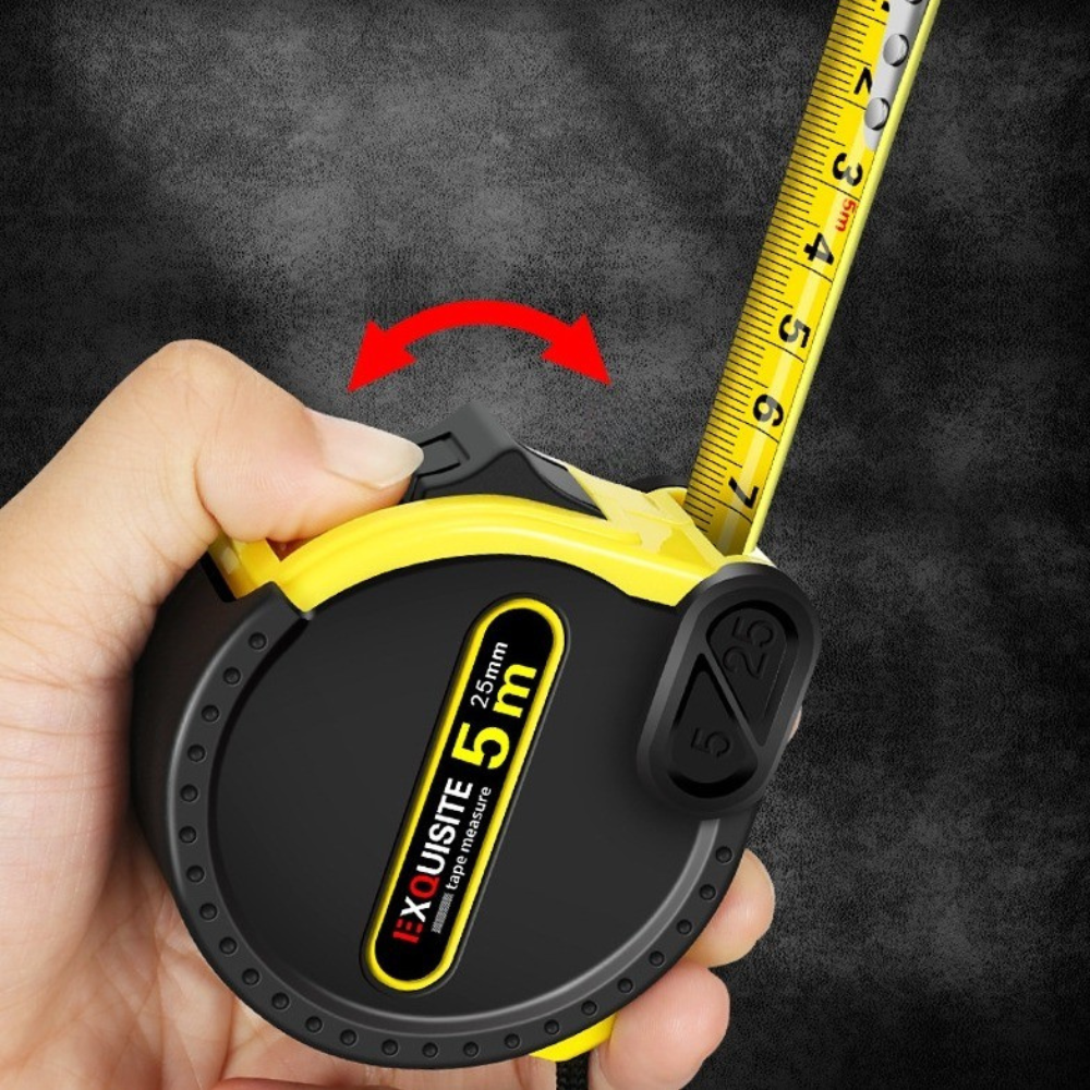 Корпус виконаний з ударостійкого пластику з прогумованими вставками, завдяки чому рулетка зручно лежить в руці і стійка до механічних пошкоджень. Вбудований механізм фіксації дозволяє зафіксувати стрічку на потрібній довжині, а металевий зачіп забезпечує точні внутрішні і зовнішні вимірювання.