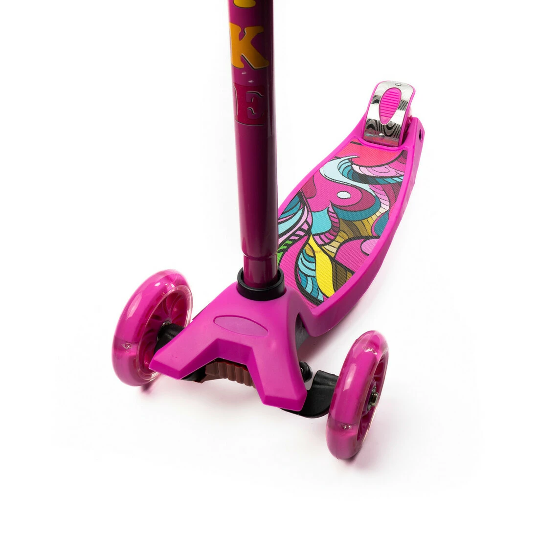 Самокат оснащений трьома колесами з поліуретану, які забезпечують стійкість та безпеку.