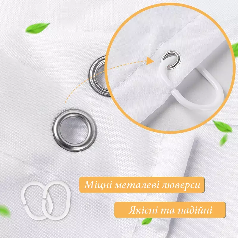 Шторка має сучасний дизайн, підходить для стандартних і подовжених ванн та душових кабін. Оснащена 12 люверсами з нержавіючої сталі та комплектується 12 пластиковими гачками (ПВХ) для зручного та надійного кріплення.