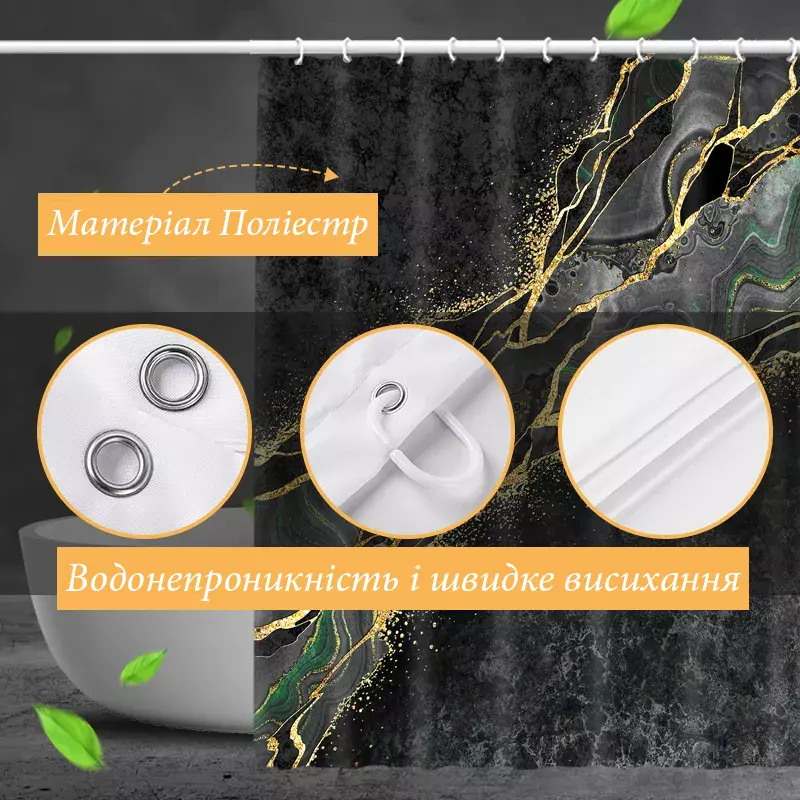 Матеріал шторки водонепроникний і швидко сохне, запобігаючи появі цвілі та забезпечуючи гігієнічність. Шторка має 12 металевих люверсів, і в комплект входять 12 гачків, що спрощує установку. Легко переться, зберігаючи свої властивості, і не потребує заміни протягом тривалого часу.