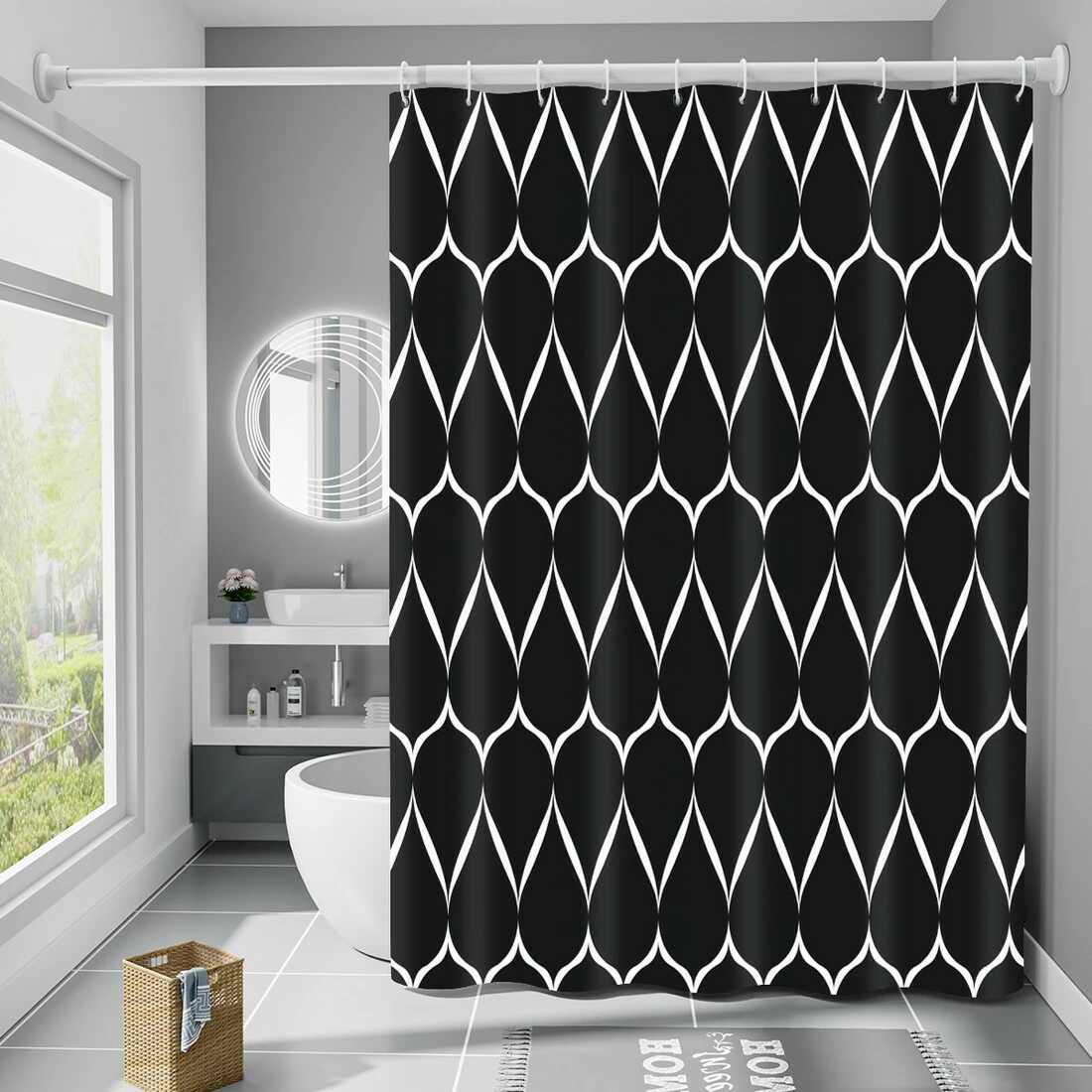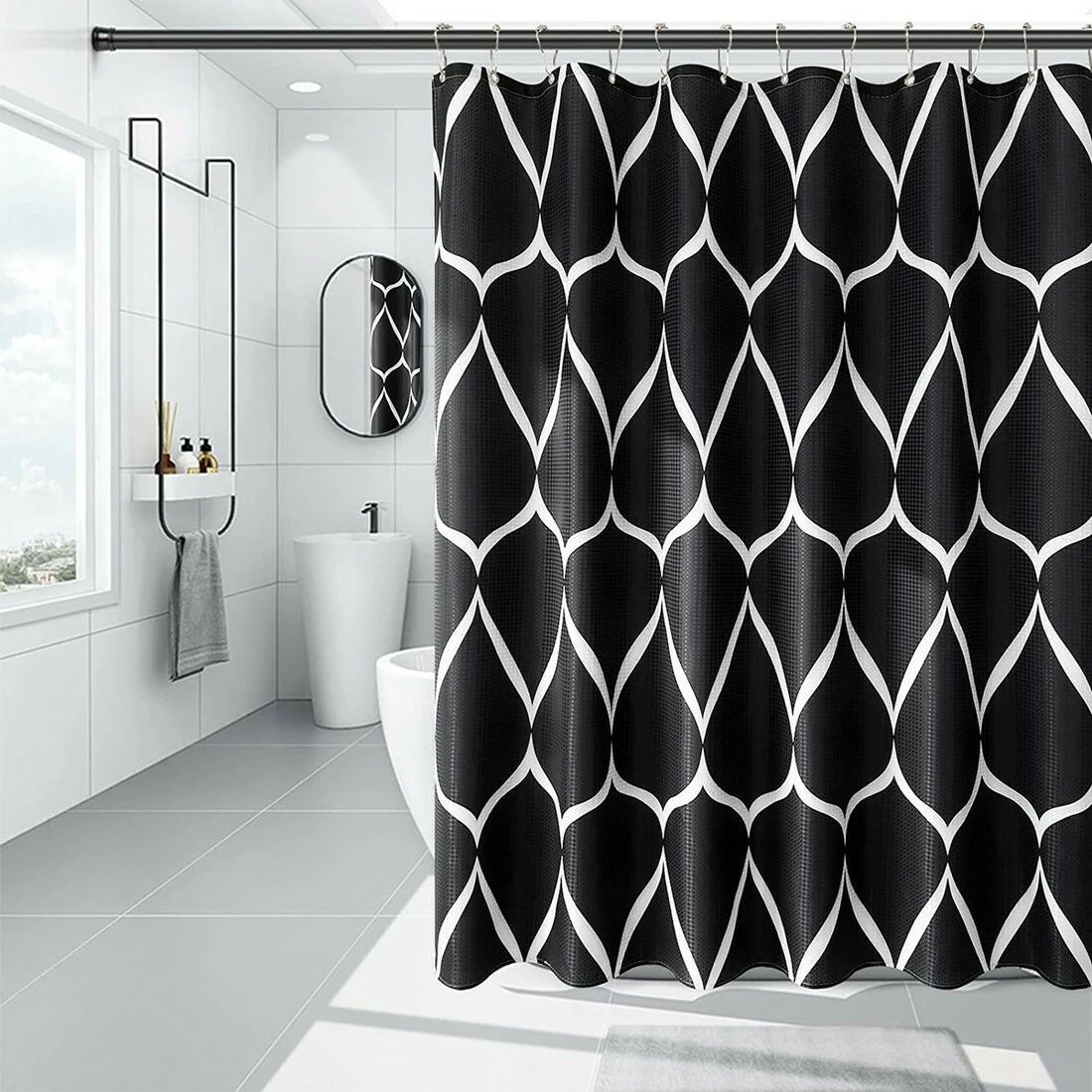 Шторка для ванни водонепроникна Bathlux 180x180 см з гачками, фіранка для ванної, Чорна з малюнком