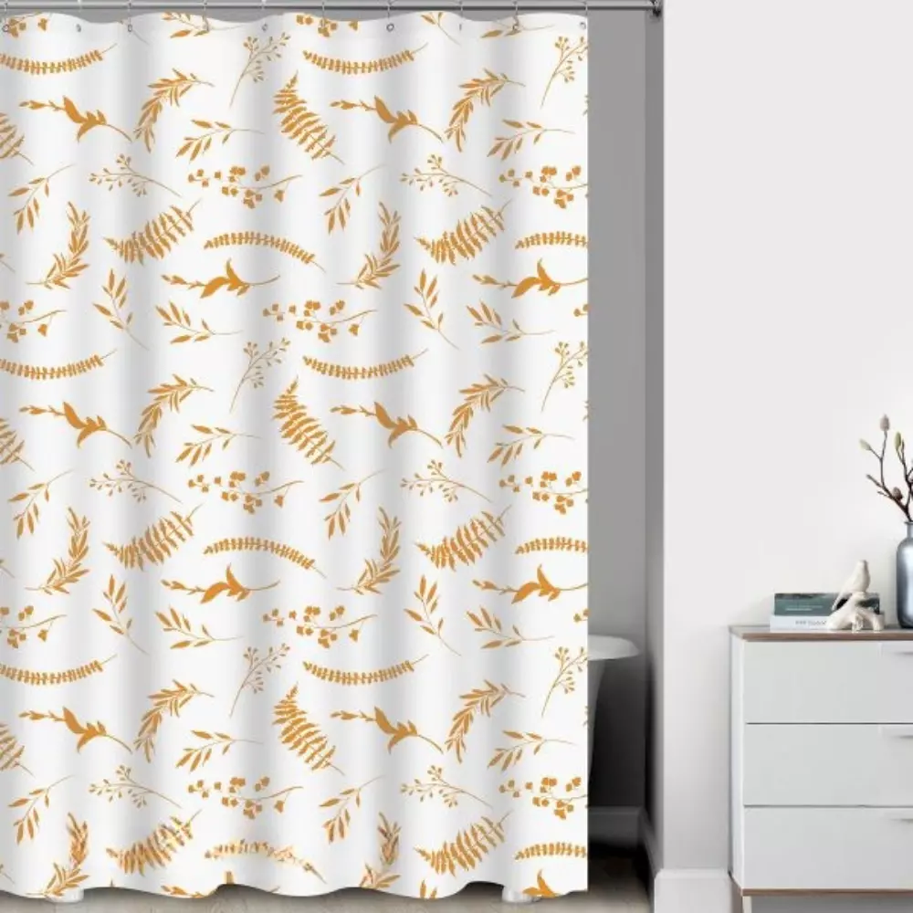 Золотисті силуети цих елементів хаотично розподілені по поверхні тканини, створюючи гармонійний та легкий образ. Дизайн надає ванній кімнаті натуральність, затишок і нотки елегантності, роблячи простір свіжим і стильним.