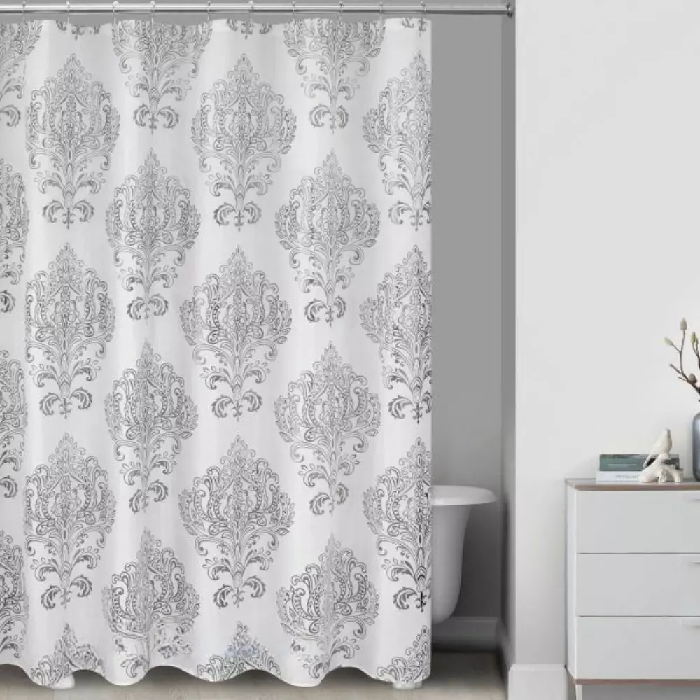 Візерунок на шторі виконаний у класичному дамаському стилі – він поєднує в собі витончені завитки, рослинні елементи та плавні лінії, створюючи ефект дорогої жакардової тканини. Сріблястий відтінок орнаменту підкреслює благородність дизайну, а симетричне розташування узору додає ванній кімнаті гармонійний і завершений вигляд.