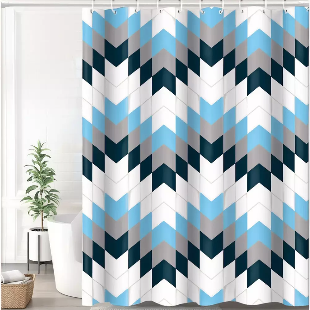 Шторка для ванної та душу 180x180 см водостійка, шторка для ванної кімнати з кільцями і гачками, біла з синім принтом