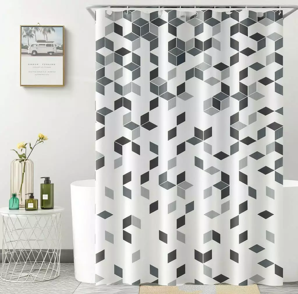 Шторка для ванної та душу 180x180 см водостійка, шторка для ванної кімнати з кільцями і гачками, біла з сірим принтом