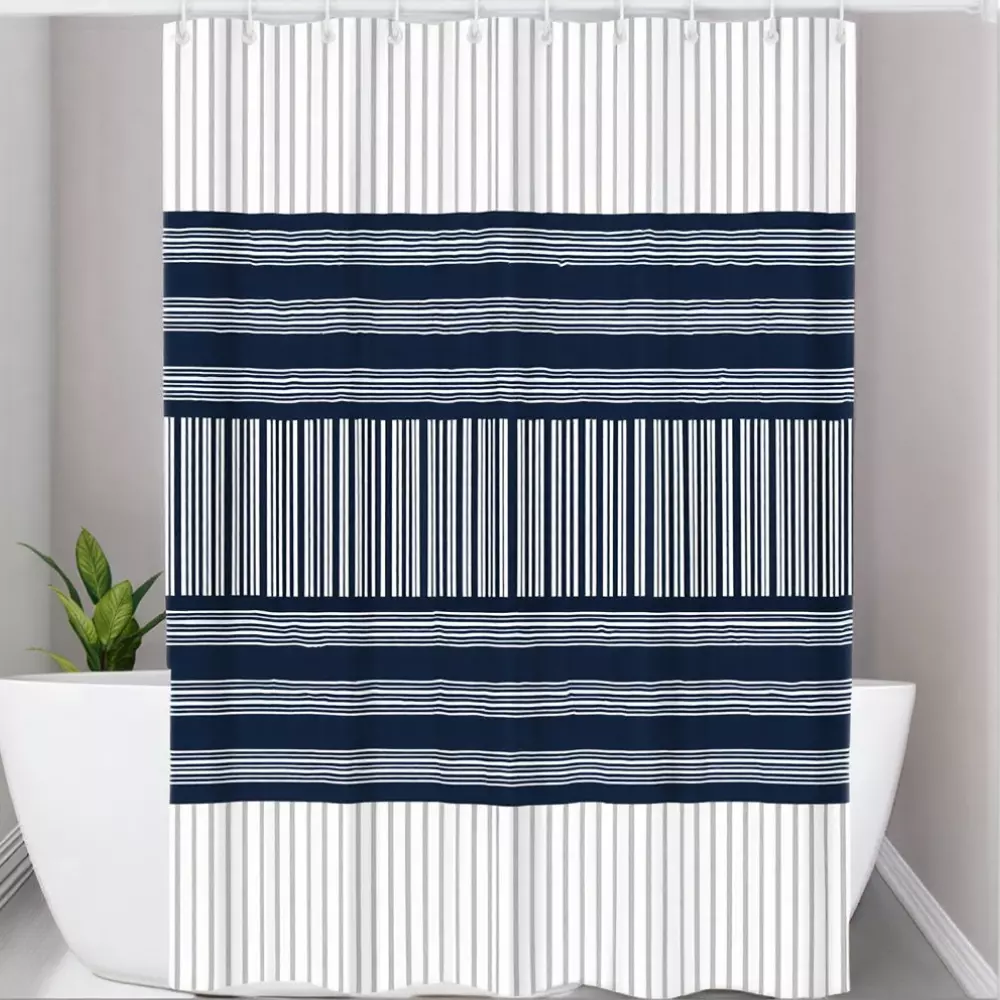 Шторка для ванної та душу 180x180 см водостійка, шторка для ванної кімнати з кільцями і гачками, біло-синя в смужку