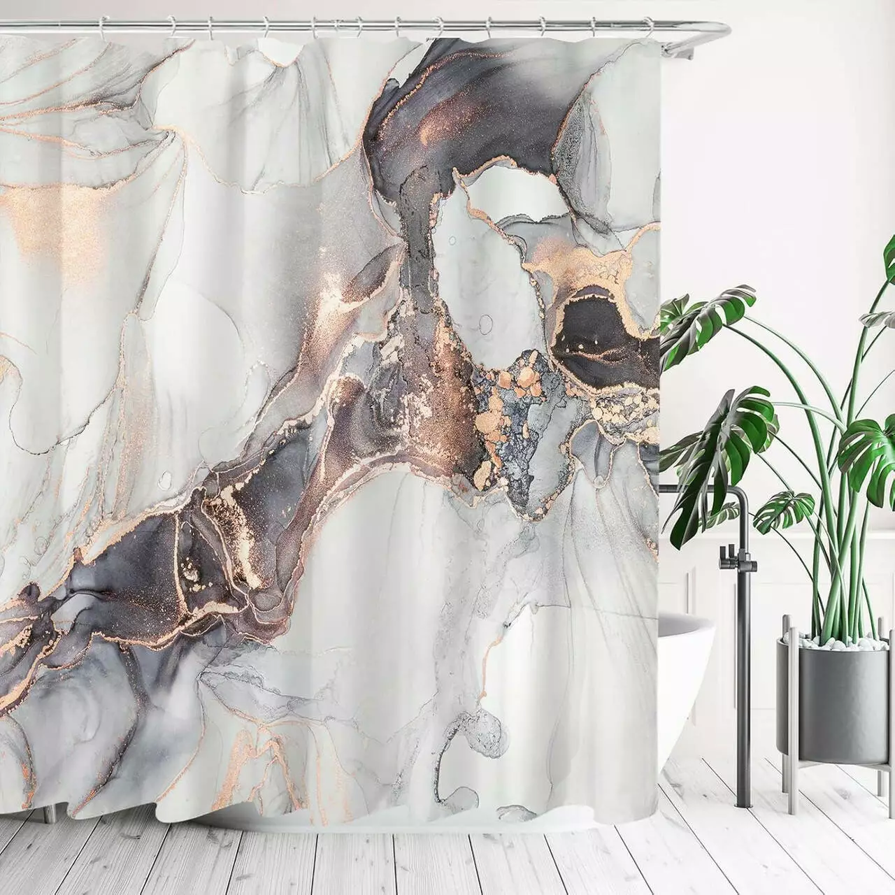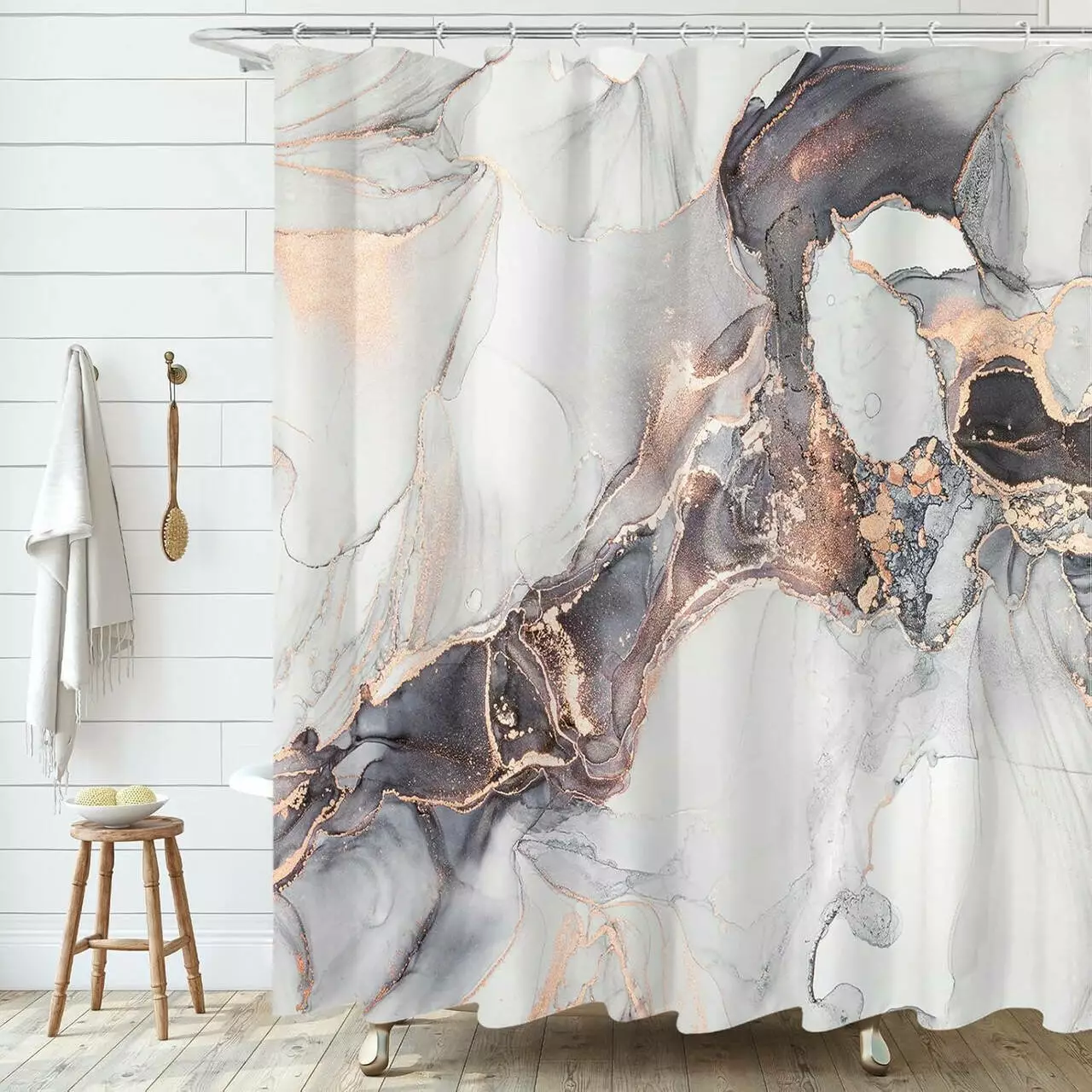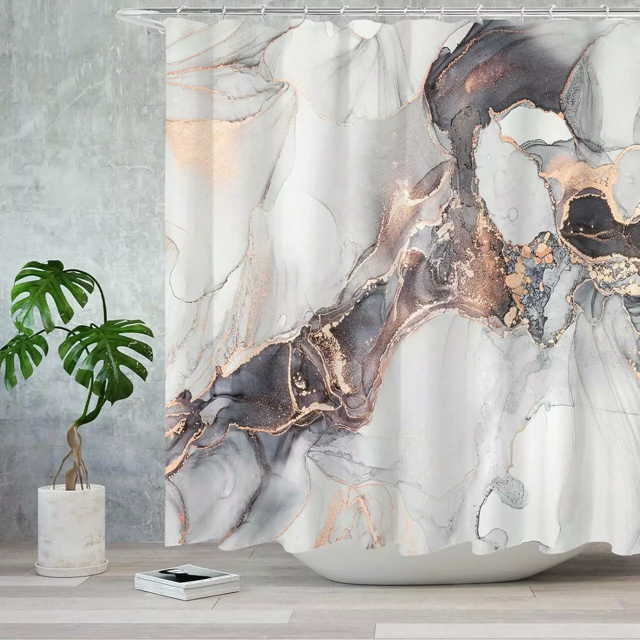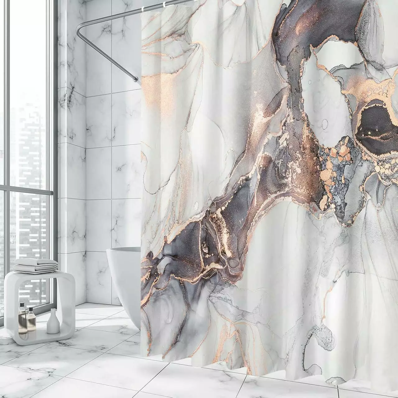Шторка для ванної та душу 180x180 см водостійка, шторка для ванної кімнати з кільцями і гачками, з мармурово-золотим принтом