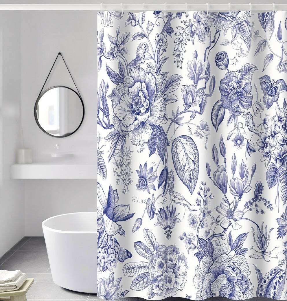 Шторка для ванної та душу з кільцями 180x180 см водостійка, шторка для ванної кімнати з гачками,біла з квітковим принтом