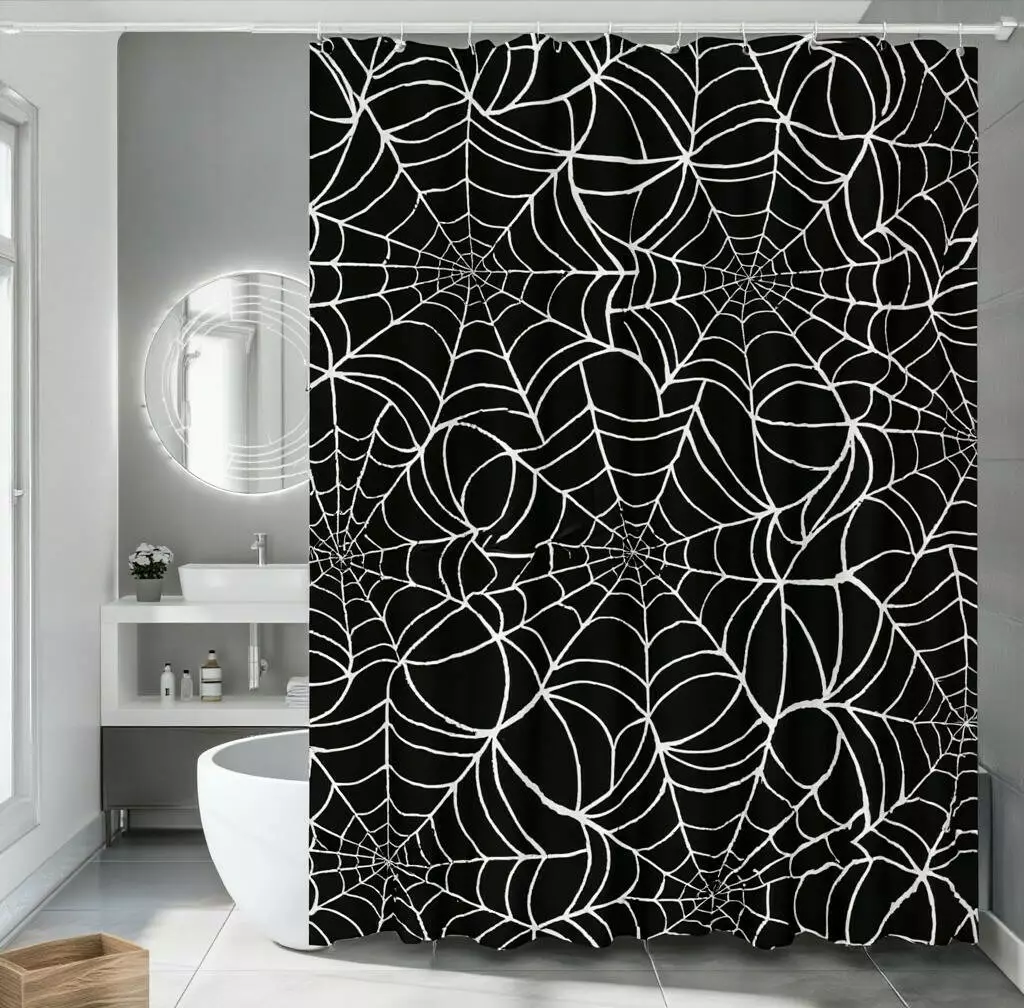 Шторка для ванної та душу з кільцями 180x180 см водостійка, шторка для ванної кімнати з гачками,чорна з принтом павутини