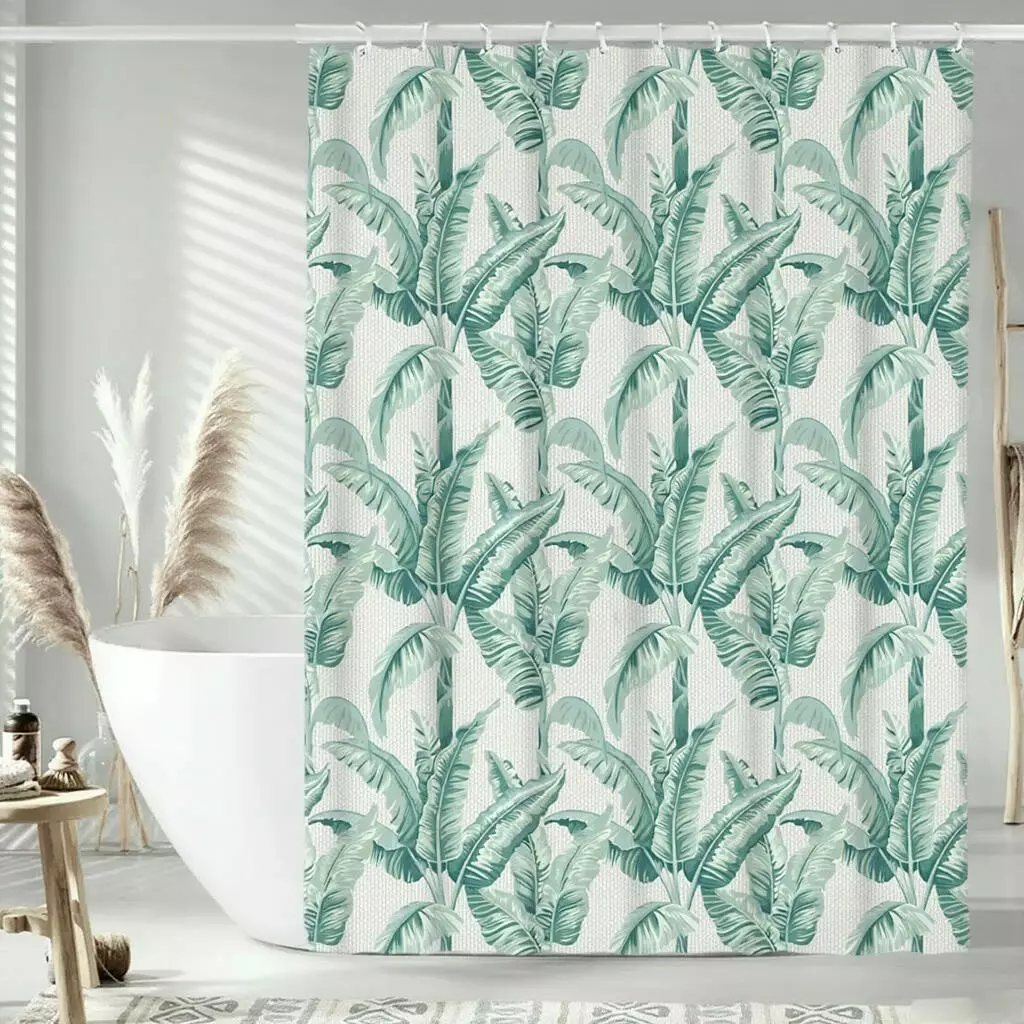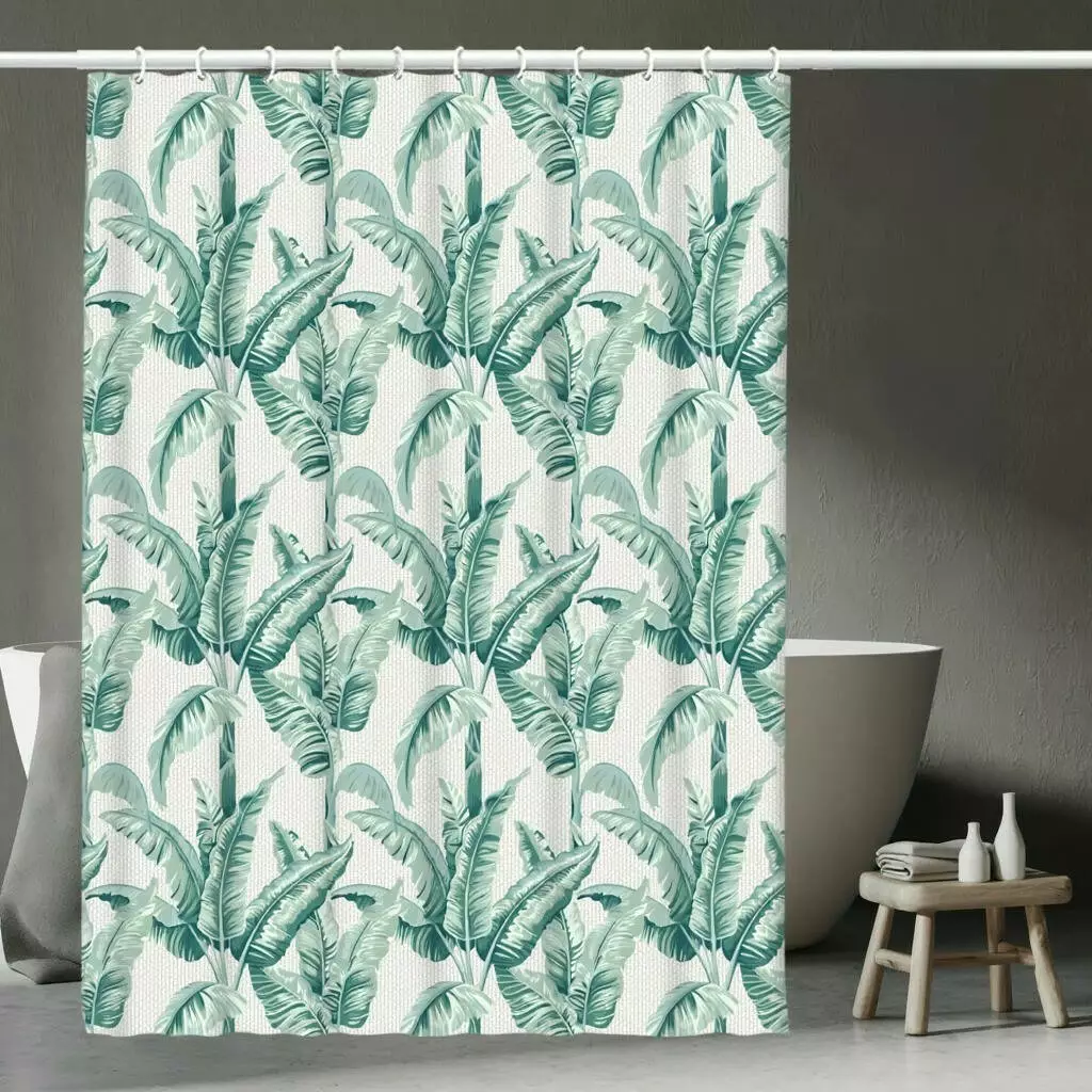 Візерунок на шторці для ванної виконаний у тропічному стилі. На світлому тлі зображені великі зелені листки бананового дерева, розташовані щільним ритмічним малюнком. Листки мають різні відтінки зеленого — від світло-м’ятного до насиченого смарагдового, що створює ефект глибини та об’єму. Принт виглядає свіжо й натурально, додаючи інтер’єру затишку та атмосферу екзотичного курорту.