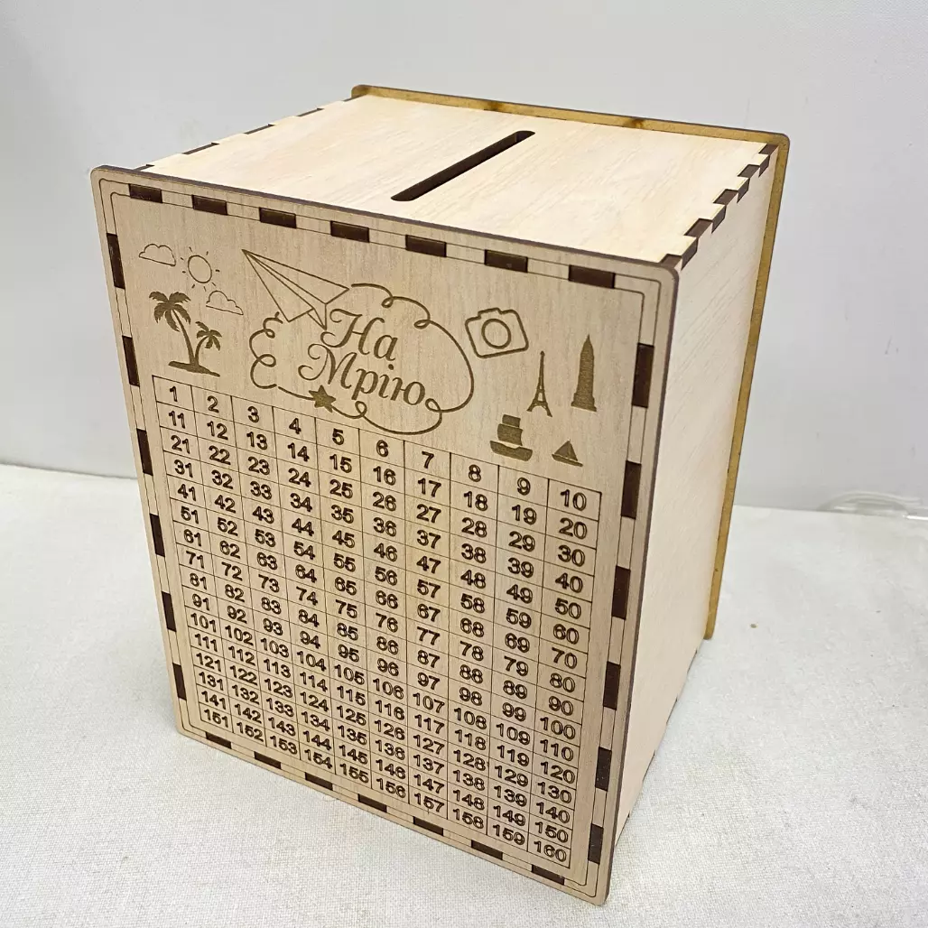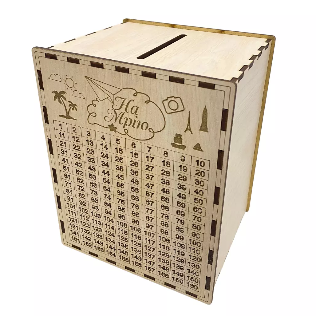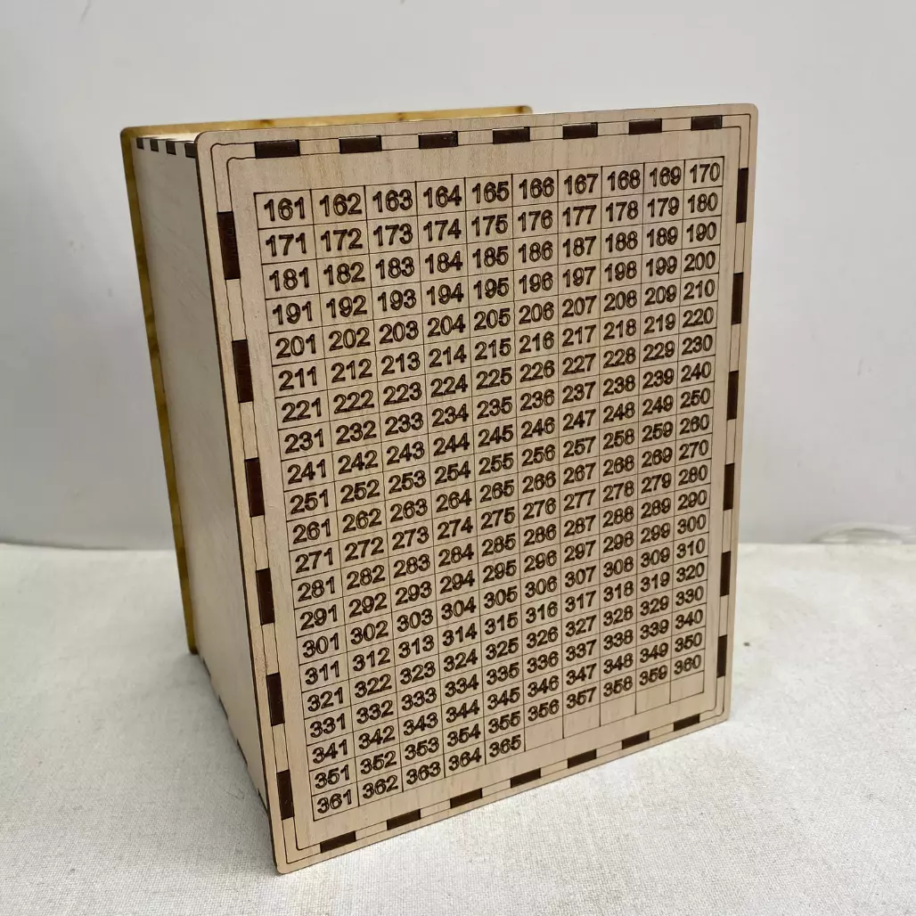 Скарбничка виконана у вигляді мініатюрного дерев'яного календаря з відсіком для грошей і монет. Завдяки зручним розмірам - 12,5 см завширшки, 19 см заввишки та 14,5 см завдовжки - вона ідеально впишеться в будь-який інтер'єр, чи то робочий стіл, чи то полиця, чи то тумба біля ліжка. Проста й оригінальна конструкція дає змогу спостерігати за прогресом накопичень і залишатися мотивованим, наближаючись до мети день за днем.