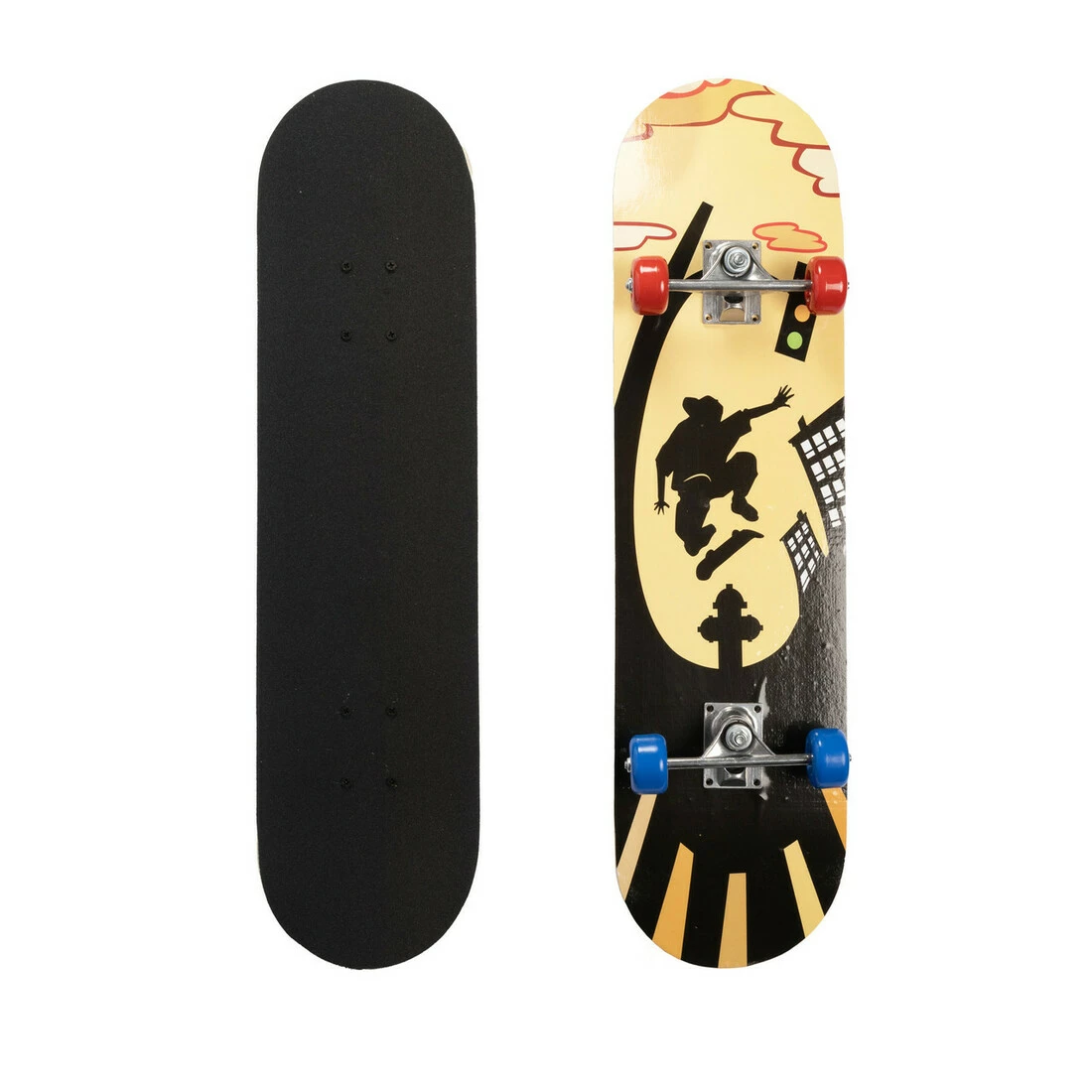 Лицьова сторона скейта покрита великою наждачкою, що забезпечує хороше зчеплення з підошвою і не дозволить нозі зісковзнути.