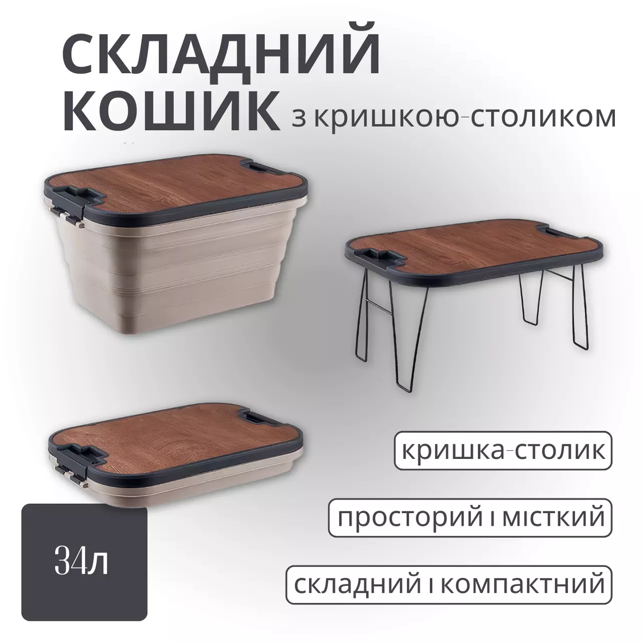 Складаний контейнер для зберігання, органайзер з кришкою-столиком, ящик для кемпінгу, 56×37×29см, сірий