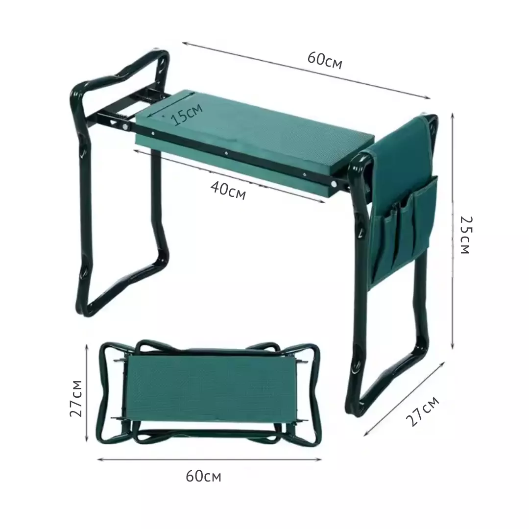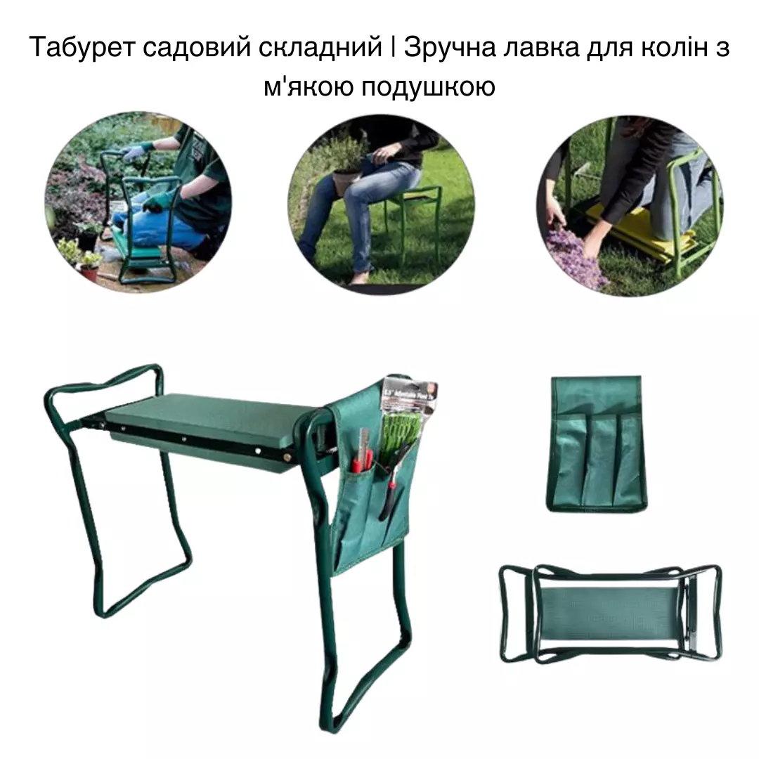 Табурет легко трансформується: використовуйте його як зручне сидіння або переверніть, щоб перетворити на підставку для колін. Міцні бічні ручки допоможуть вставати без зайвого навантаження. Компактна складна конструкція робить зберігання і перенесення зручними, а легка вага дає змогу без зусиль переміщати його по саду.