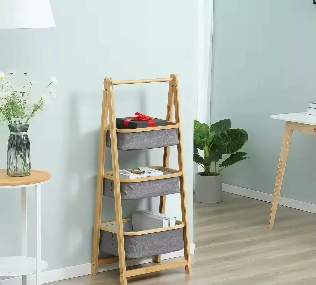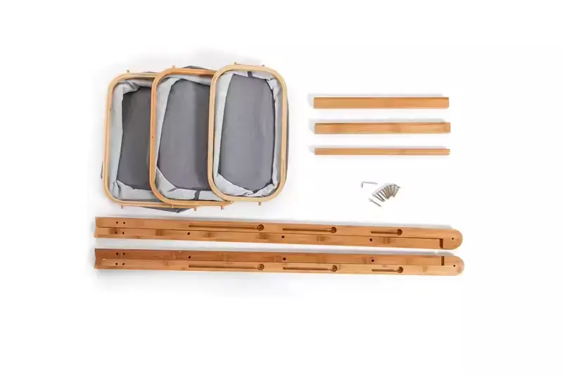 Складна полиця для одягу з бамбука з тканинними кошиками на три