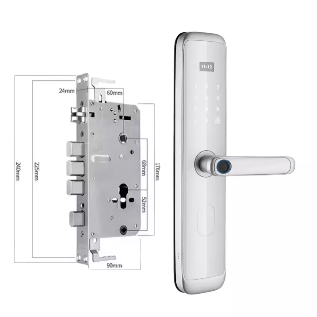 Замок підходить для стандартної врізки 24*240 6068 мм і легко монтується. Його живлення здійснюється від чотирьох батарейок типу АА, які забезпечують довгу автономну роботу. Можливість програмування до 100 відбитків пальців робить його ідеальним для великих сімей або офісів. Розмір панелі 77 х 376 мм забезпечує зручність експлуатації.