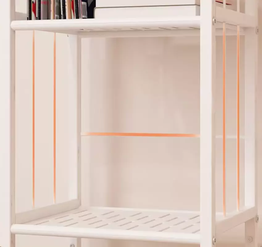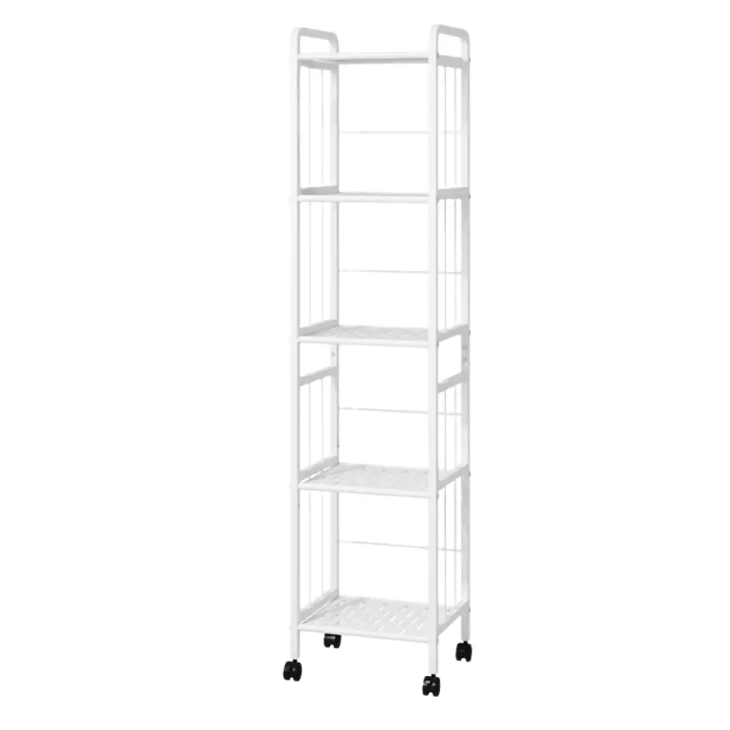 Пересувний стелаж оснащений п'ятьма ярусами, які дають змогу зручно зберігати різноманітні предмети - рушники, косметику, книги або інші аксесуари. У каркасі стелажа встановлені металеві прути, що надає конструкції додаткову стабільність і надійність.
