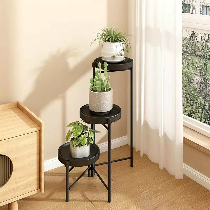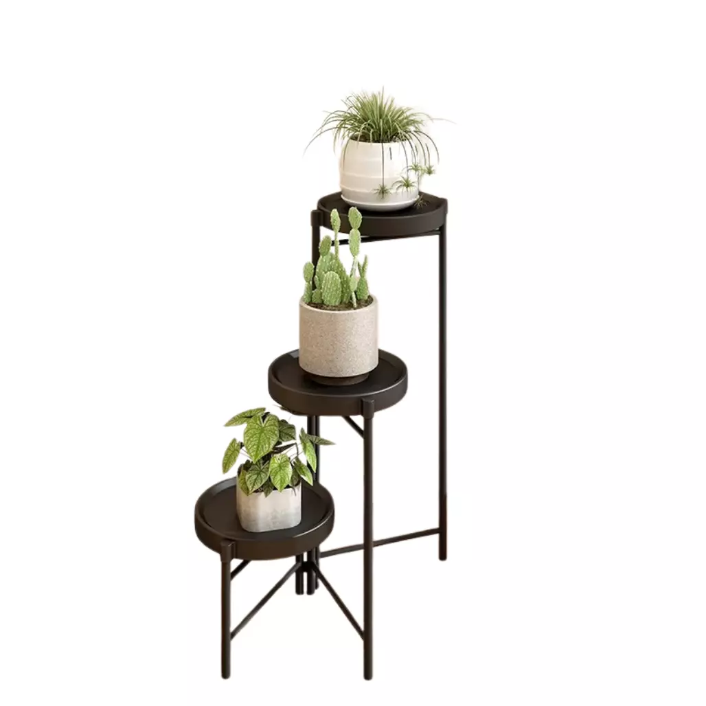 Полиця для рослин і квітів пластикова з металевим каркасом на 3 яруси з круглими підставками, колір чорний
