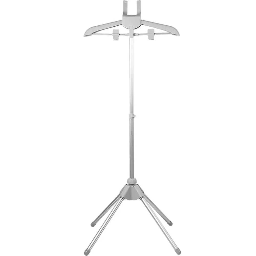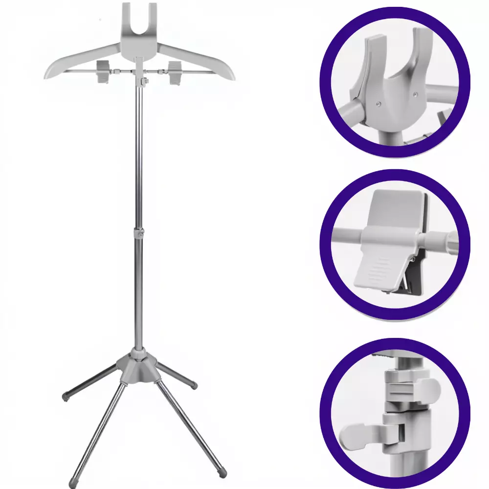 Стійка оснащена телескопічною штангою з регульованою висотою від 85 до 160 см, що дозволяє налаштувати її під зріст та робочі умови. Міцна алюмінієва основа з пластиковими елементами гарантує довговічність і стійкість навіть під час інтенсивного використання. Висувні тримачі та зручні прищіпки дозволяють фіксувати одяг різних типів — від сорочок до верхнього одягу.