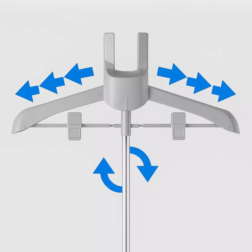 Верхня вигнута вішалка обертається, що дає можливість розташовувати одяг під будь-яким кутом, забезпечуючи зручний доступ під час відпарювання. Протиковзкі накладки на основі запобігають зміщенню стійки та забезпечують стабільність.