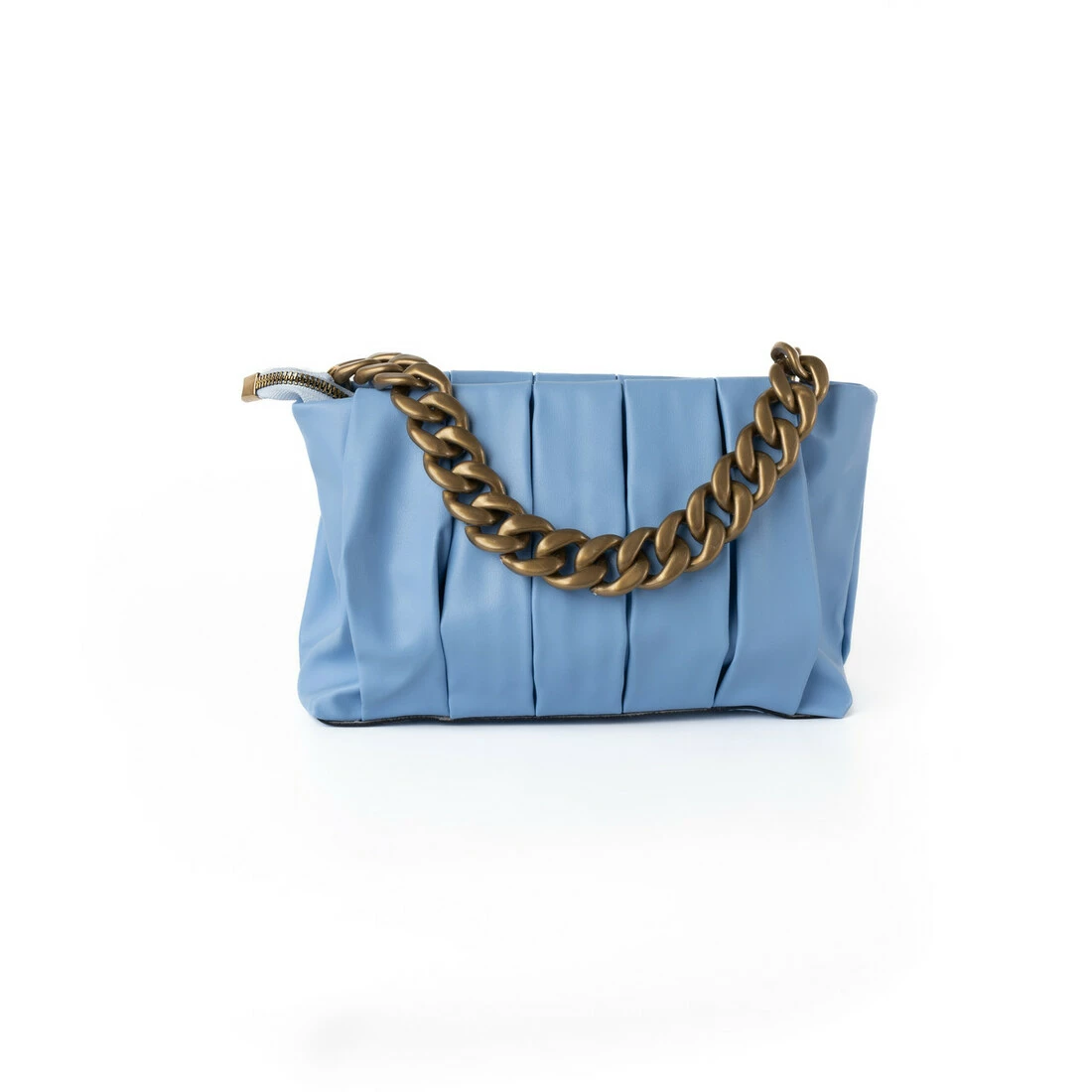 Сумка застібається на змійку блискавку. Яскравим декором цієї стильної сумочки є ручка-ланцюжок золотого кольору.