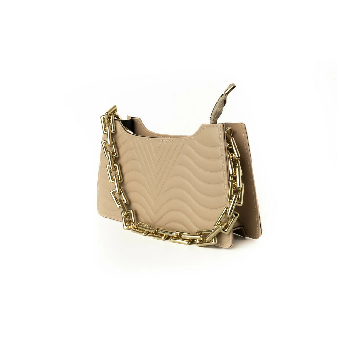 Сумка застібається на змійку блискавку. Яскравим декором цієї стильної сумочки є ручка-ланцюжок золотого кольору.