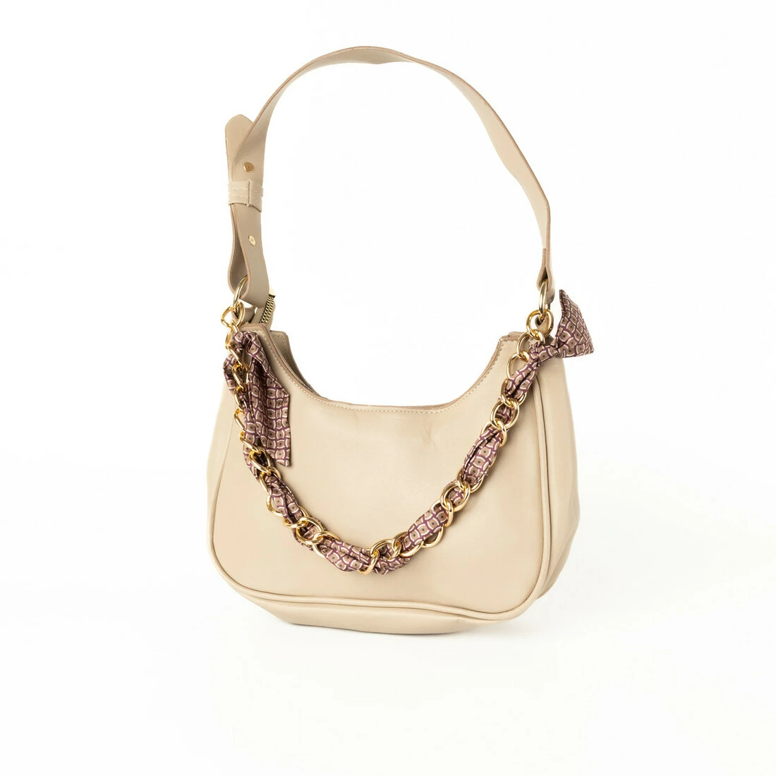 Яскравим декором цієї стильної сумочки є ручка-ланцюжок із стрічкою.