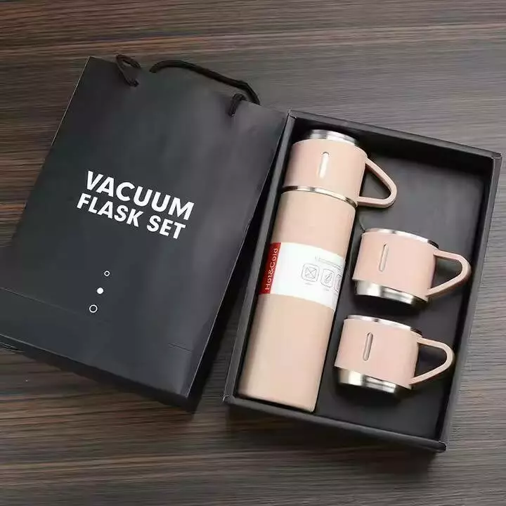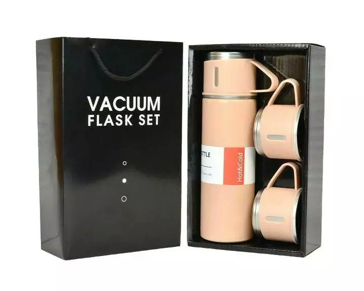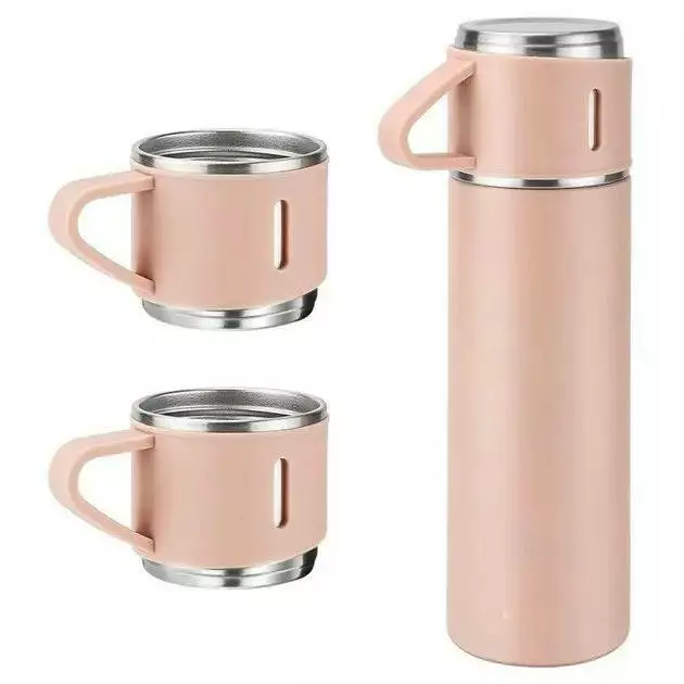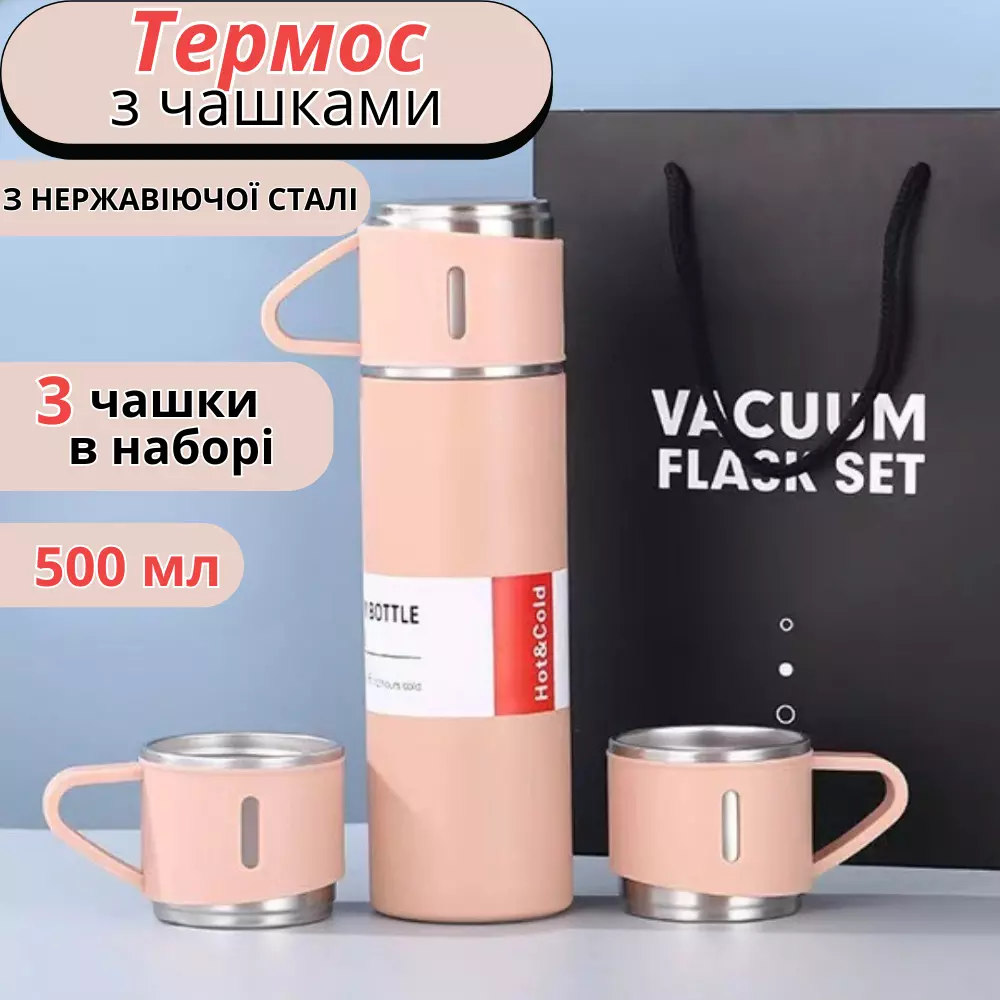 Термос 500 мм Набір подарунковий, вакуумний з нержавіючої сталі та 3 чашки комплект колір рожевий