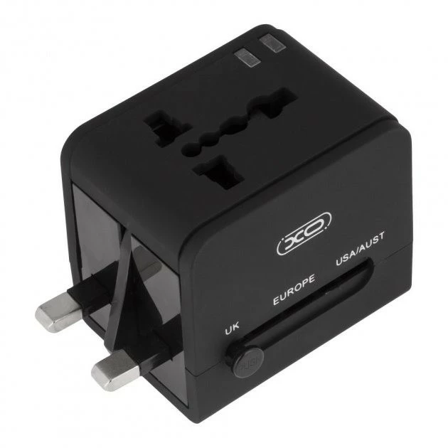 Універсальний зарядний пристрій XO WL01 UK/EU/US, мережний перехідник з двома USB портами Чорний