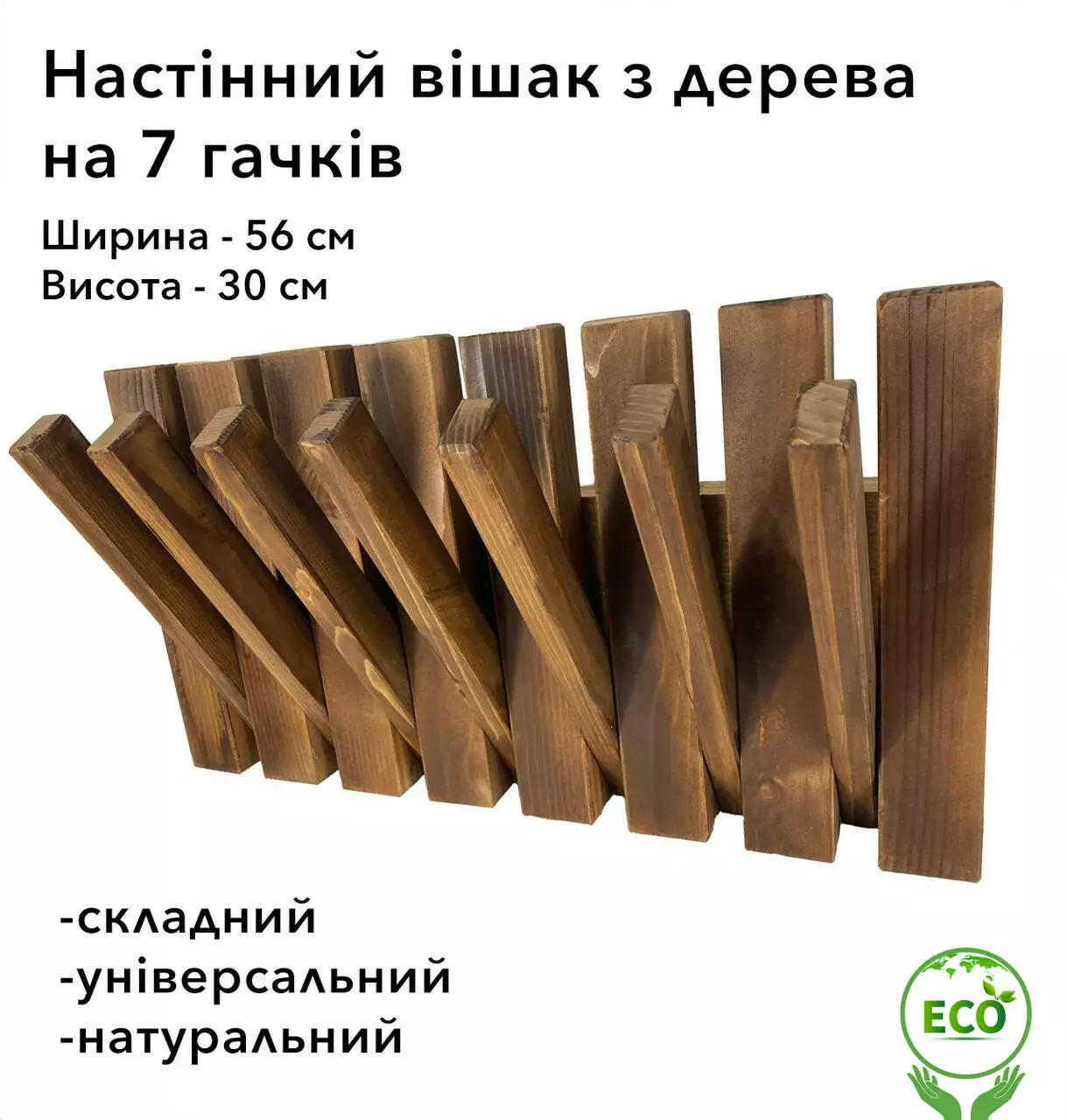 Вішак виготовлений із високоякісної смереки та модрини, що надає йому природну красу та довговічність. Завдяки сучасному дизайну та розмірам 56×30 см, він легко впишеться в будь-який інтер'єр.
