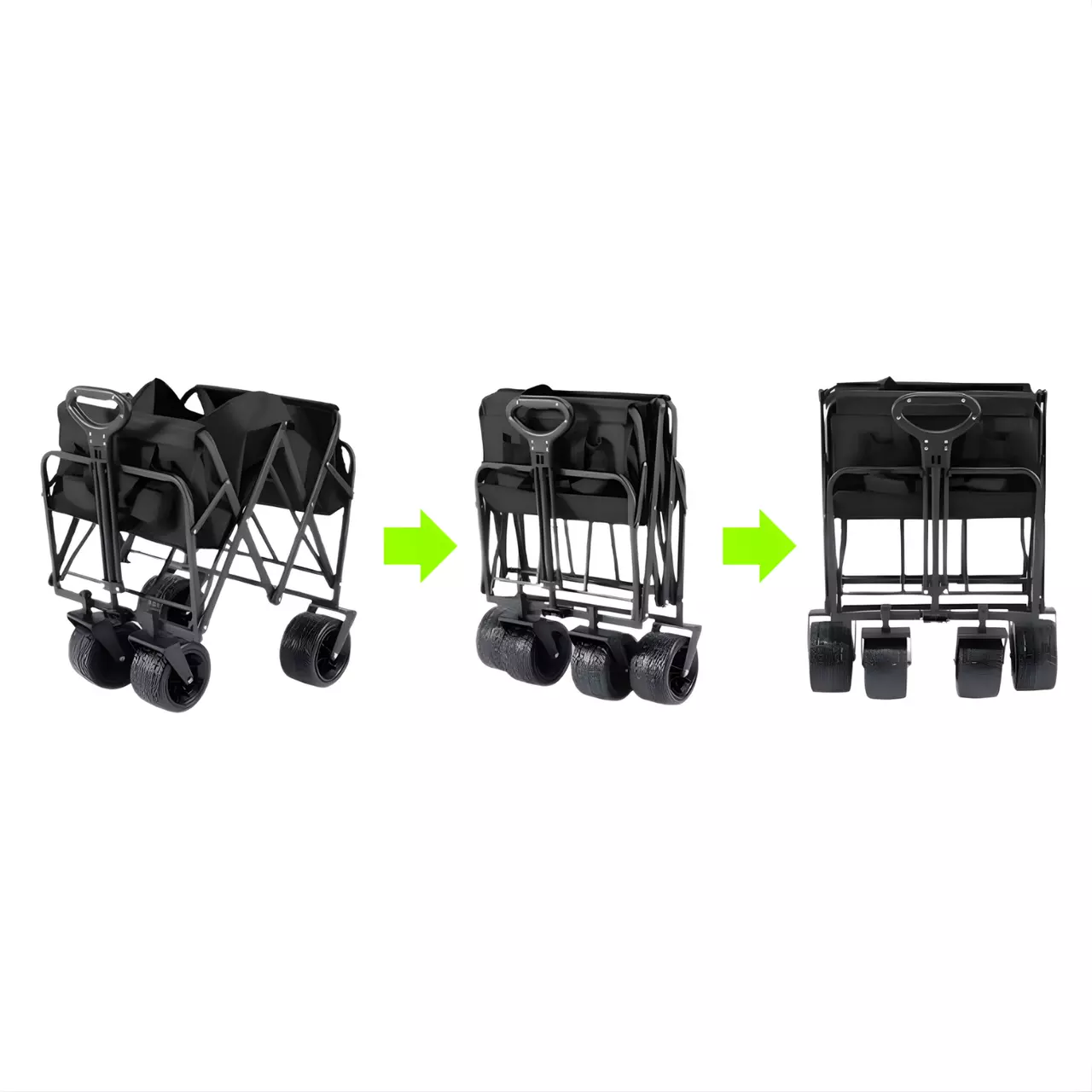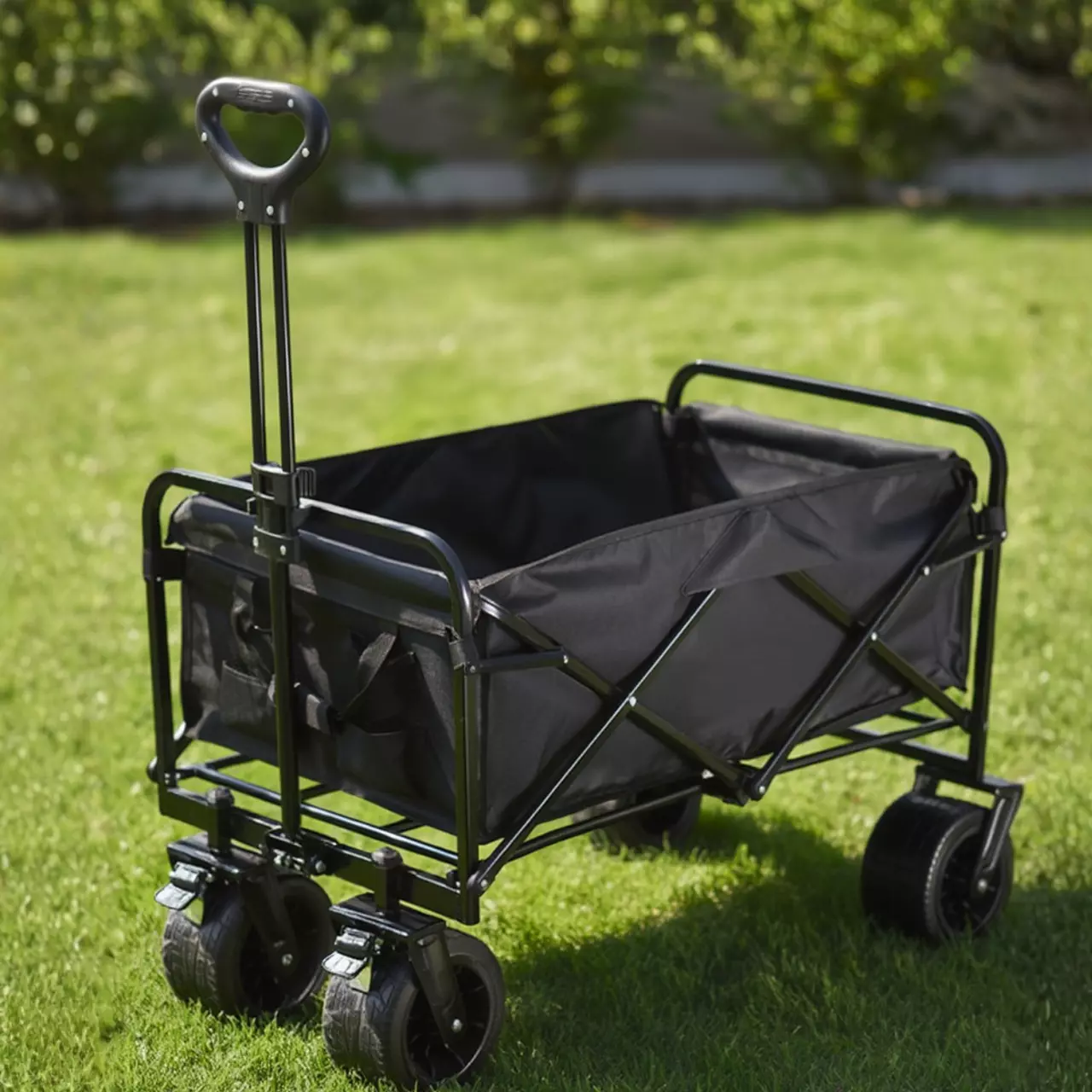 Візок оснащений регульованою по висоті ручкою (74–97 см) для комфортного керування. Чотири широкі PVC-колеса розміром 17×10 см забезпечують відмінну прохідність і стійкість навіть на нерівній поверхні. Модель додатково обладнана двома ножними гальмами для надійної фіксації на місці, а також має два додаткові кишені для пляшок з водою. Легко складається для зберігання та транспортування.