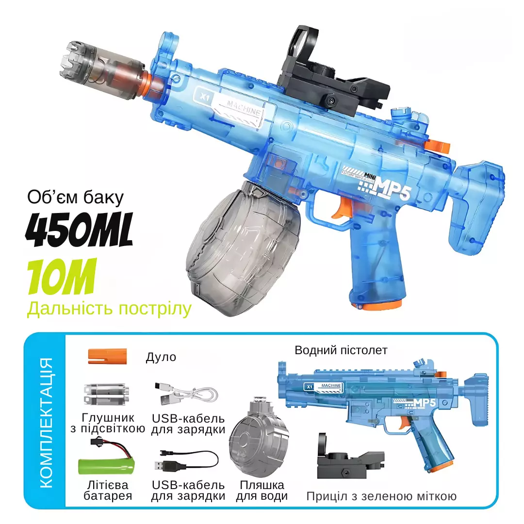 Комплектація: водяний автомат МР5, дуло, глушник зі світловими ефектами, приціл із лазерним зеленим підсвічуванням, акумулятор, USB-кабель для заряджання, резервуар для води об'ємом 450 мл