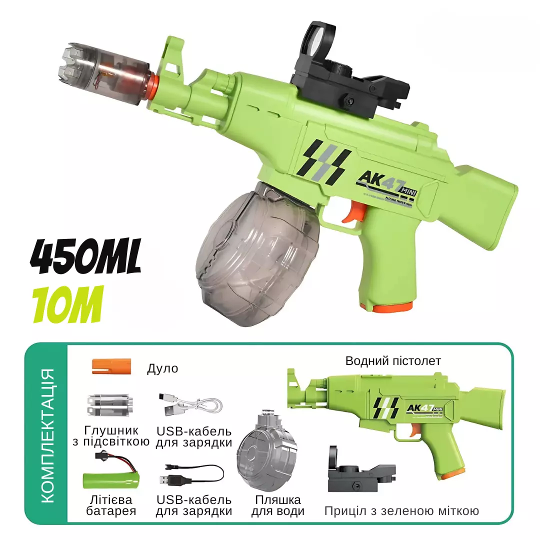 Комплектація: водяний пістолет АК47, дуло, глушник зі світловими ефектами, приціл з лазерним зеленим підсвічуванням, батарея, USB-кабель для заряджання та резервуар для води 450мл