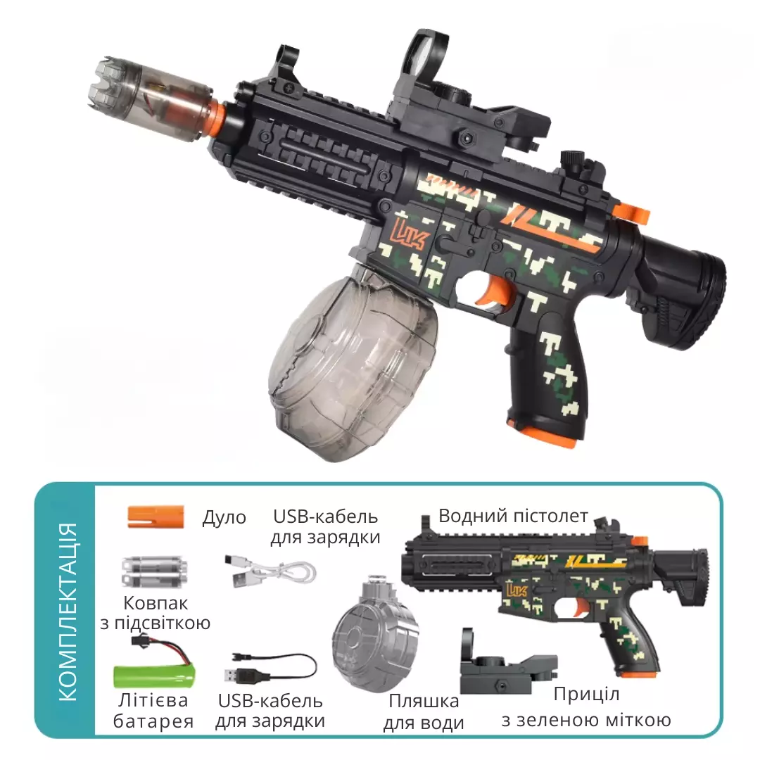 Комплектація: водяний пістолет М416, дуло, глушник зі світловими ефектами, приціл з лазерним зеленим підсвічуванням, батарея, USB-кабель для заряджання та резервуар для води 450мл