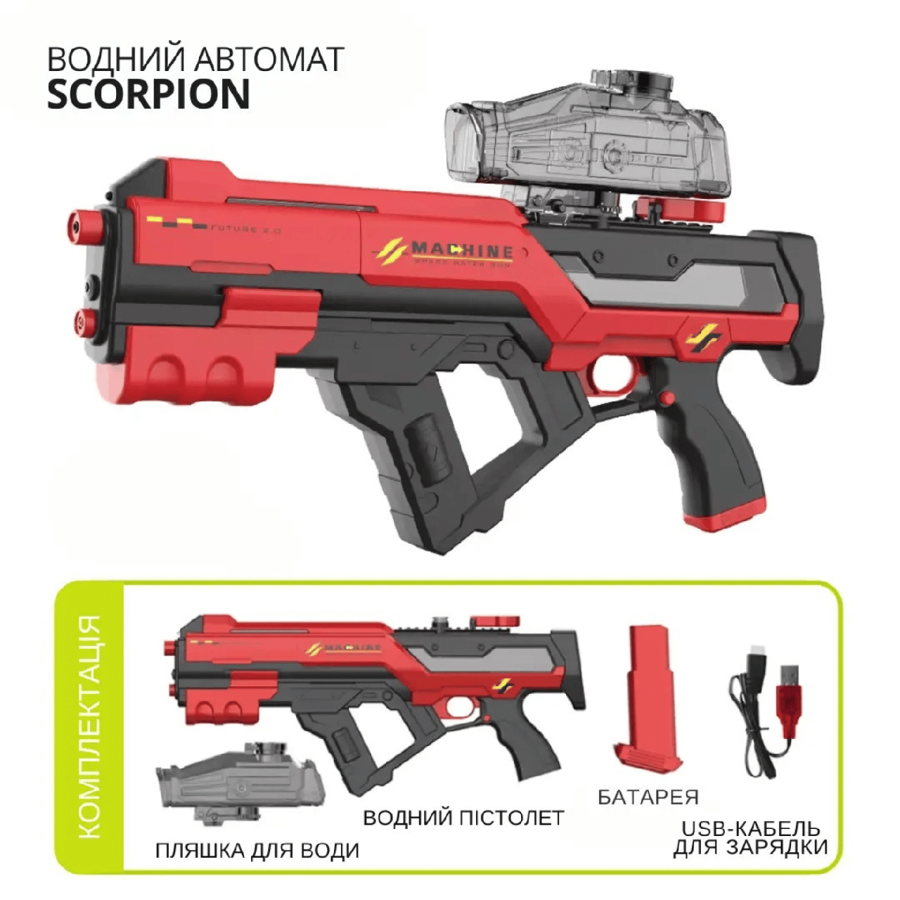 Водний пістолет для дітей, електричний водний автомат «Скорпіон» дитячий з автоматичним закачуванням води, червоний