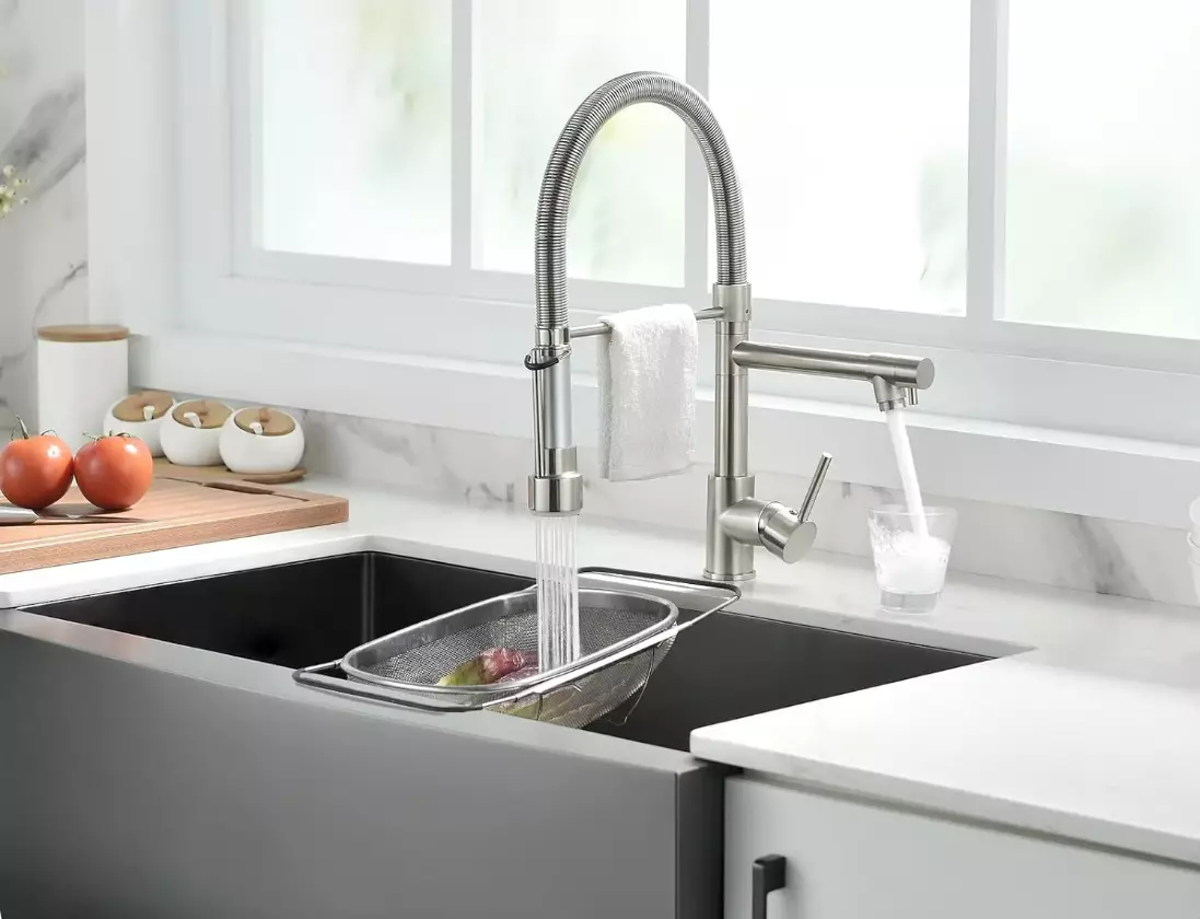 Цей кухонний змішувач поєднує практичність і стильний дизайн. Корпус виконаний з високоякісної латуні з вмістом до 59.9%, що забезпечує міцність і довговічність конструкції. Матовий нікель надає сучасного вигляду, а виливи з неіржавкої сталі роблять використання змішувача зручним і універсальним. Завдяки висувному і стаціонарному виливу, ви зможете легко перемикатися між різними режимами використання.