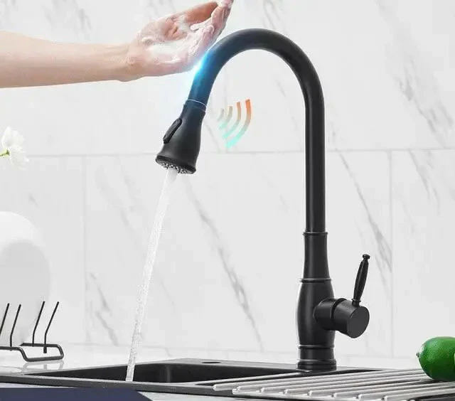 Змішувач сенсорний для раковини з висувним виливом, кран обертається на 360 градусів WanFan Чорний
