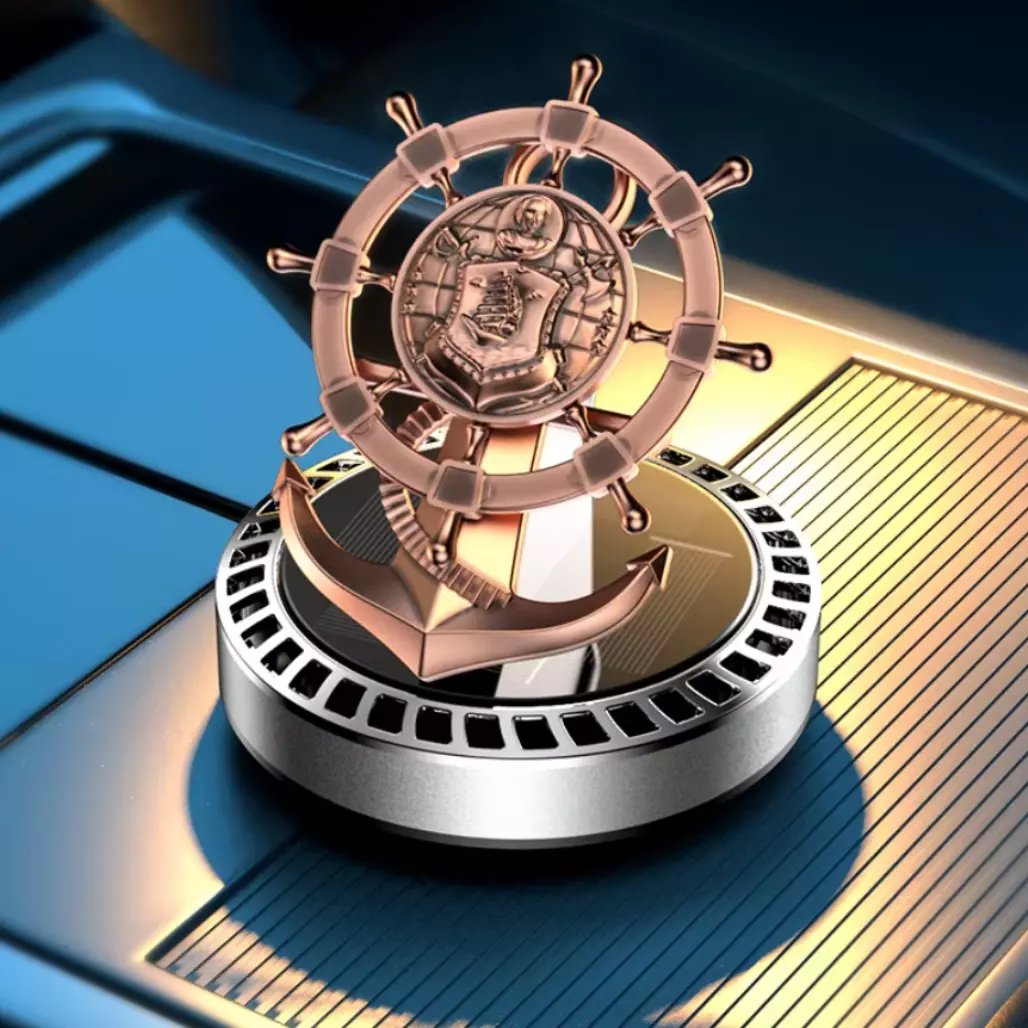 Штурвал начинает вращение при попадании солнечных лучей, благодаря встроенной солнечной батарее. Этот эффект не только завораживает своим видом, но и способствует равномерному распространению аромата "Океан", наполняя салон свежестью и комфортом, создавая ощущение лёгкости и свободы.