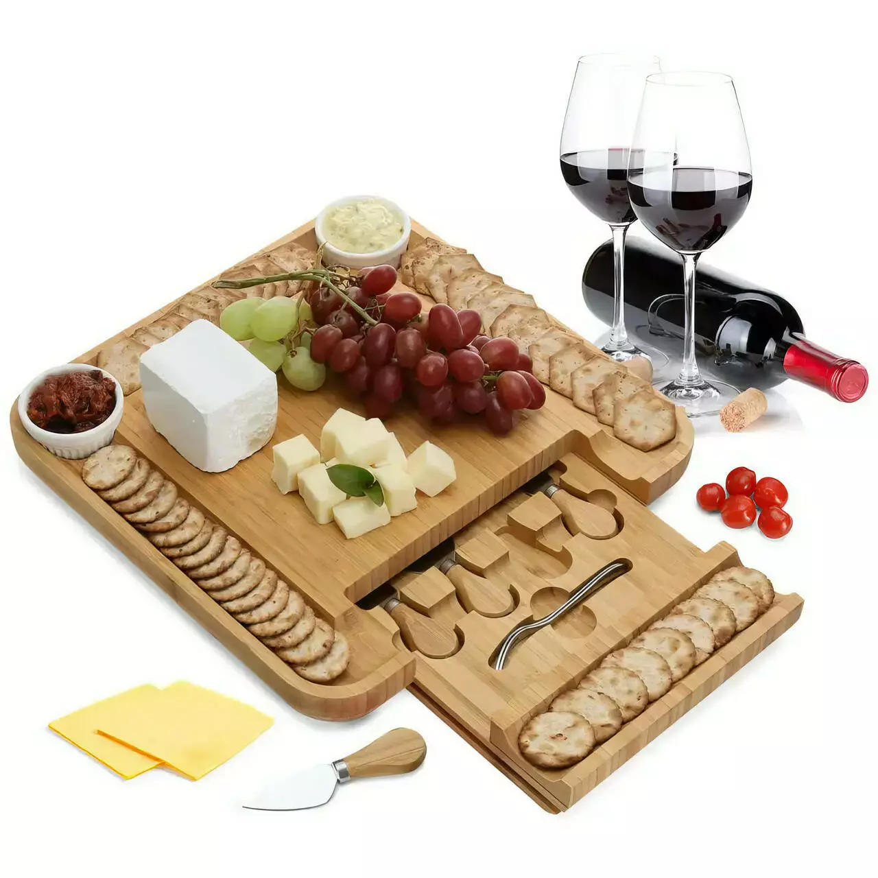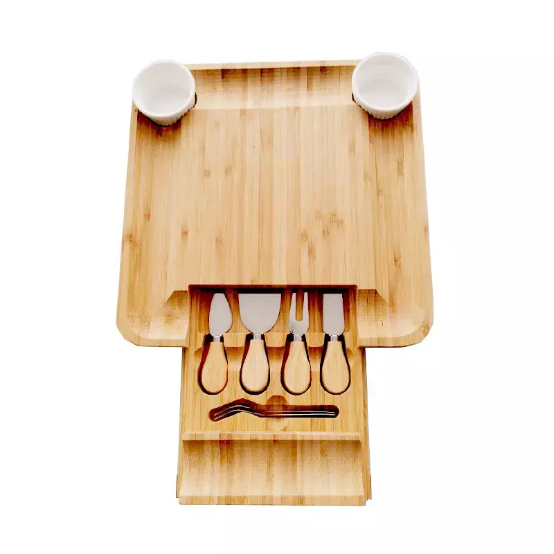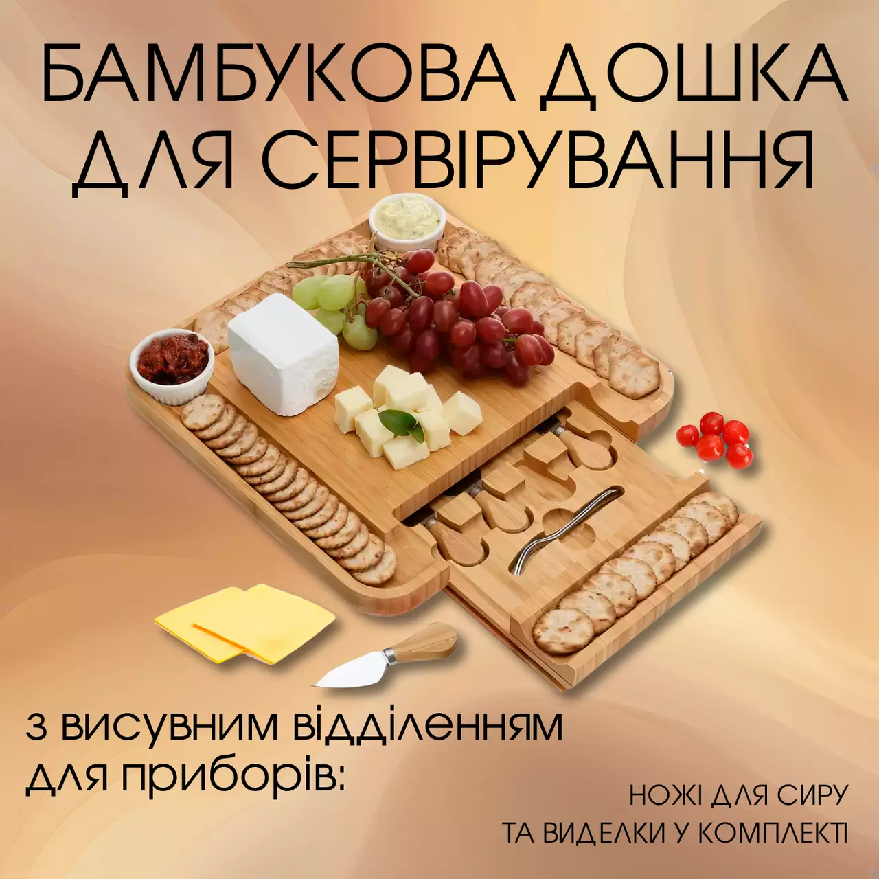 Бамбуковая доска для сыра с ножами и вилками, размером 34х34х4см, поднос из бамбука с выдвижным отделением