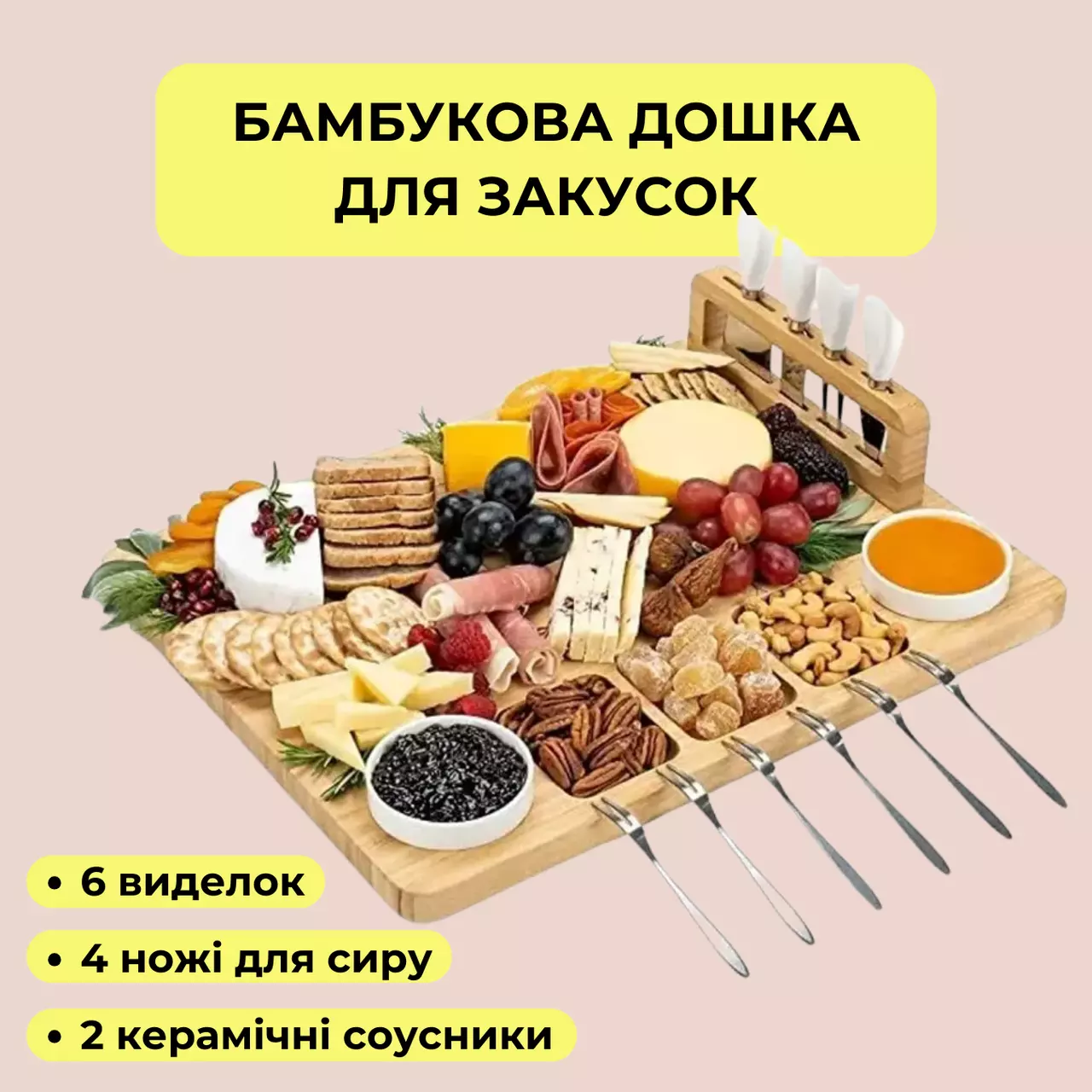 Бамбуковая доска для закусок и сыра с набором ножей и вилок, размером 43х33х2см, доска из бамбука