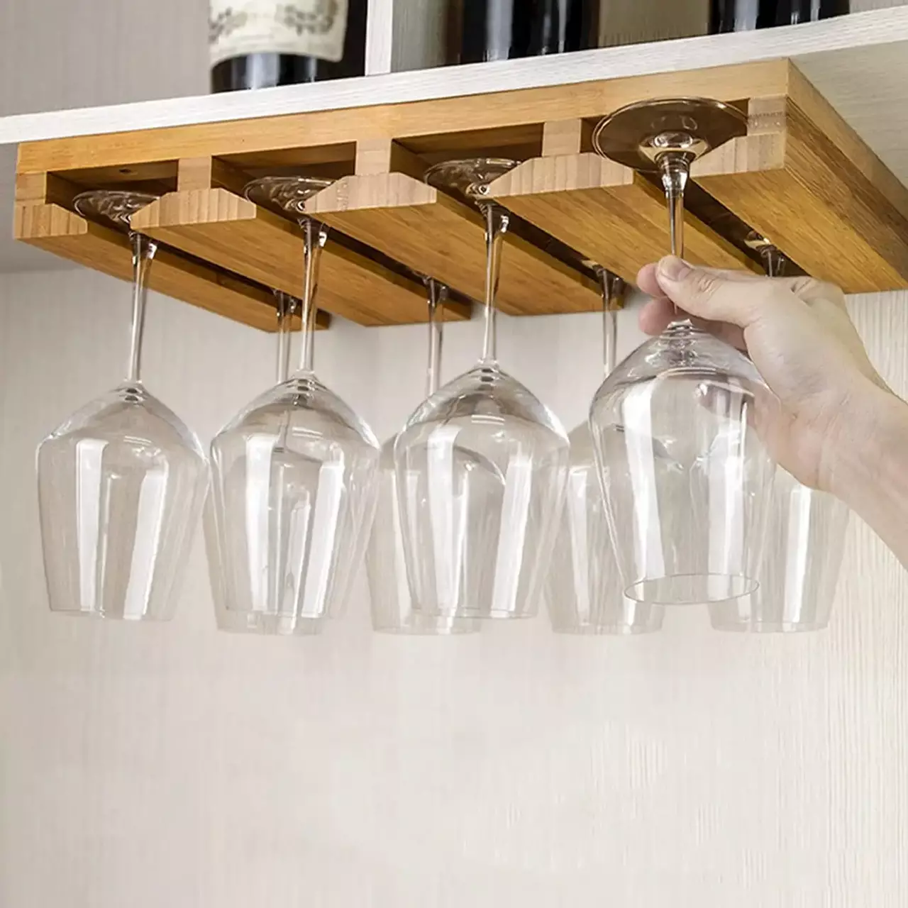 Бамбуковая полка легко крепится под полками или шкафами, обеспечивая надежное хранение бокалов в четыре ряда. Натуральный материал придает изделию экологичный и современный вид, а прочность гарантирует долговечность использования.